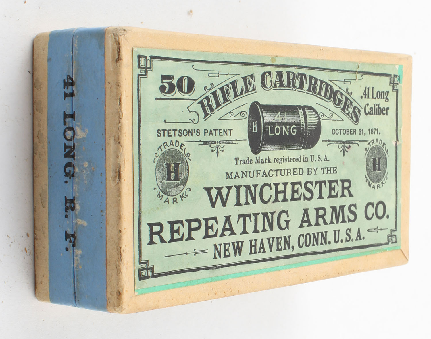 Winchester, Rifle Cartridges, .41 Long Rim Fire, 2pc., FULL & SEALED, Buff box with green label & blue wraparound label, box is very solid with excellent color, corners are sharp, edges are crisp. Grade: Excellent ++ - Value: 100 to 200