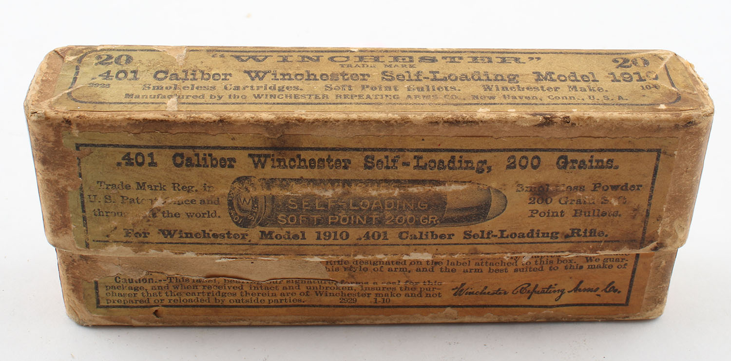 Winchester, .401 Winchester Self-Loading, 200 Grain SP Bullet, Partial 17rds., 2pc., Buff box with orange labels, box has age soiling with scuffing, has edge wear, label is 90% intact, ammo is excellent. Grade: Very Good ++ - Value: 40 to 80