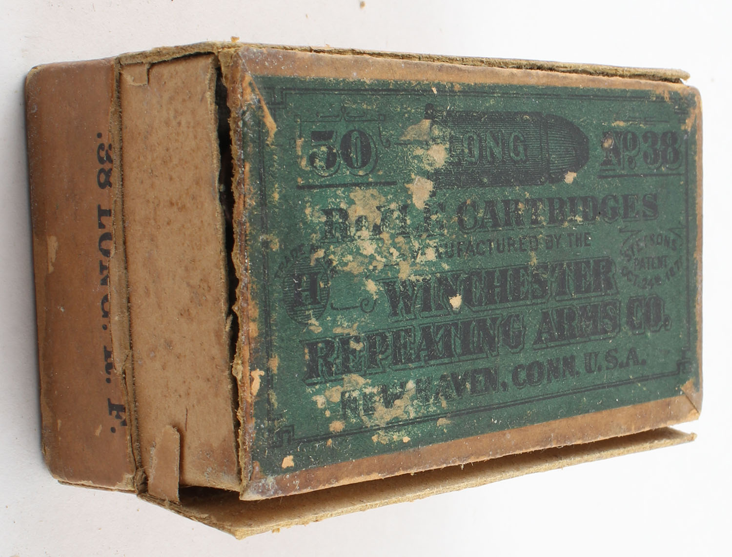 Winchester, Rifle Cartridges, .38 Long Rim Fire, FULL & SEALED, 2pc., Buff box with green top & orange side sealing label, box has seam splits to top & bottom, has age soiling with scuffing & edge wear, ammo is good. Grade: Good - Value: 40 to 120