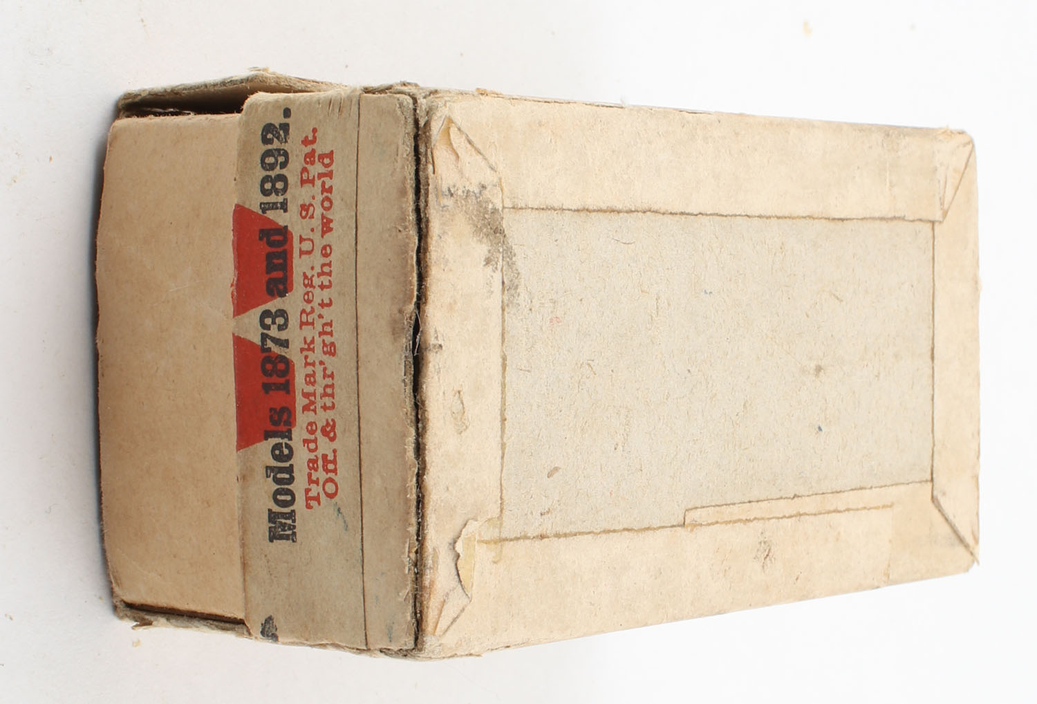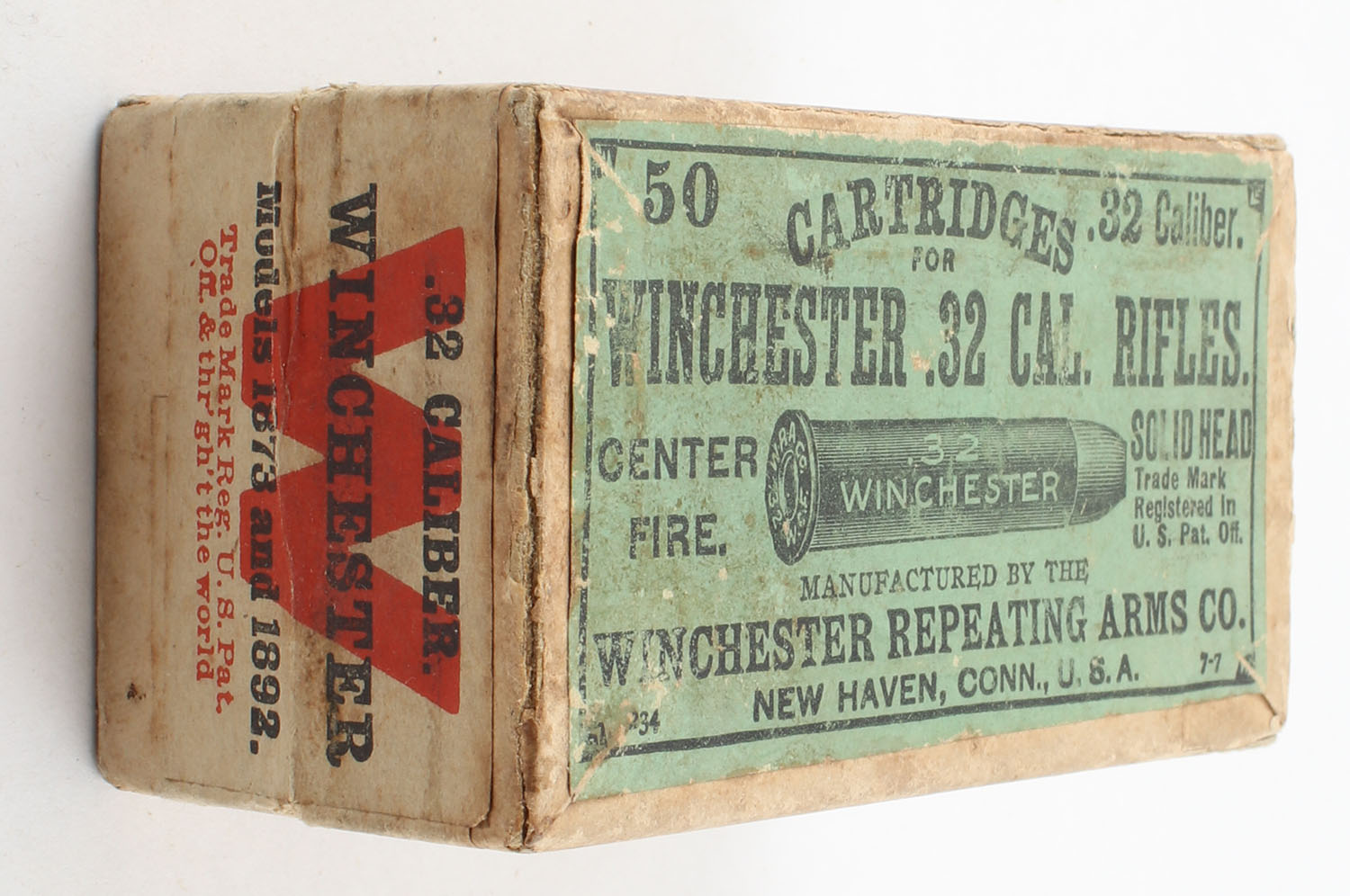 Winchester, Center Fire, .32 Winchester, Solid Head, Full, 2pc., Buff box with green top & buff side sealing labels, top has a missing right end flap, box has edge wear with light scuffing, labels are intact, ammo is very good. Grade: Very Good + - Value: 40 to 200