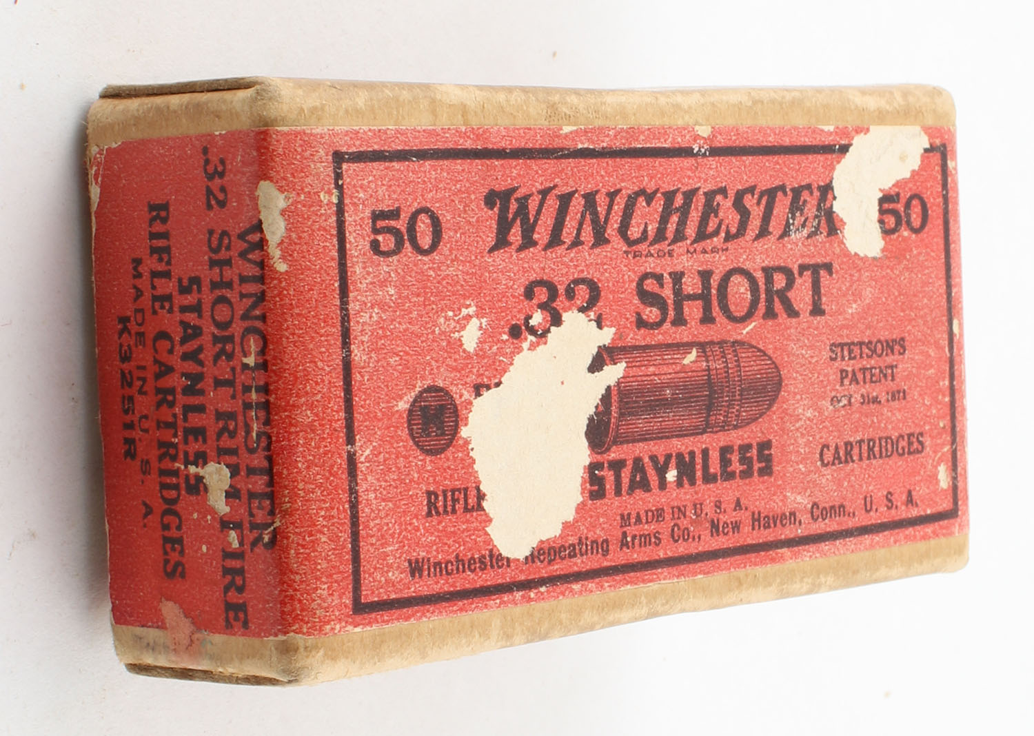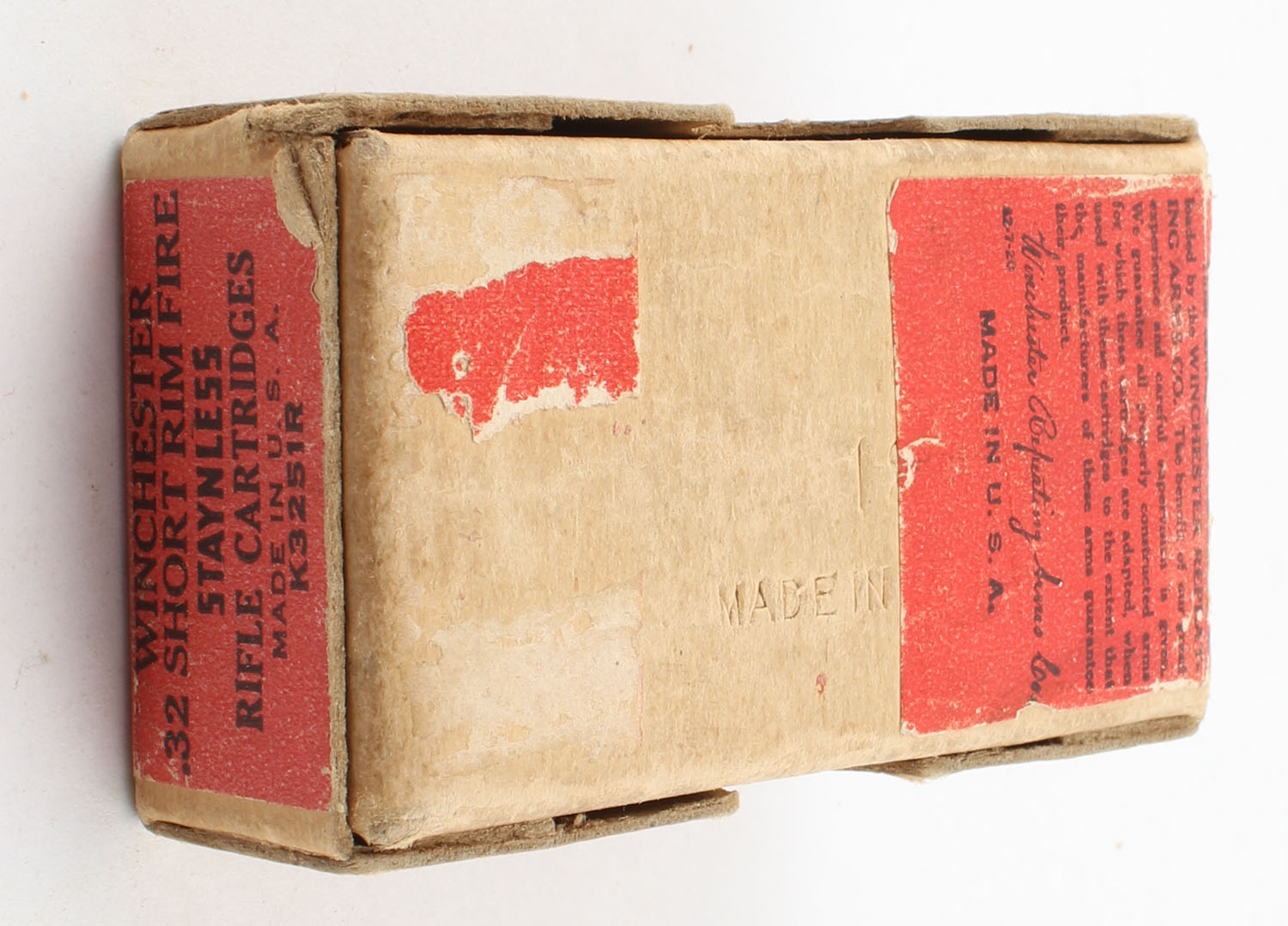 Winchester, Staynless, .32 Short Rim Fire, Partial 15rds., 2pc., Buff box with red wraparound label, box is solid with great color to label, has two tears to front label, bottom is missing half the label, ammo is excellent. Grade: Very Good - Value: 20 to 60