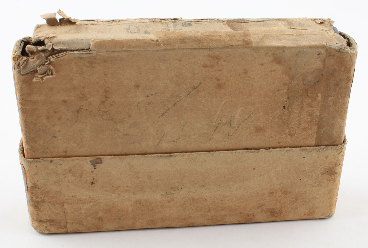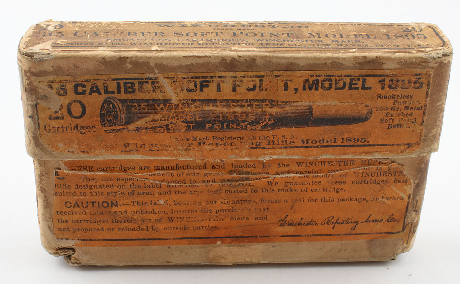 Winchester, .35 Winchester Model 1895, Smokeless, 250 Grain Soft Point Bullets, Full, 2pc. Buff box with orange label & black print, box has age soiling with scuffing, has edge & corner wear with partial seam splits to bottom, ammo is very good to excellent. Grade: Good ++ - Value: 50 to 100