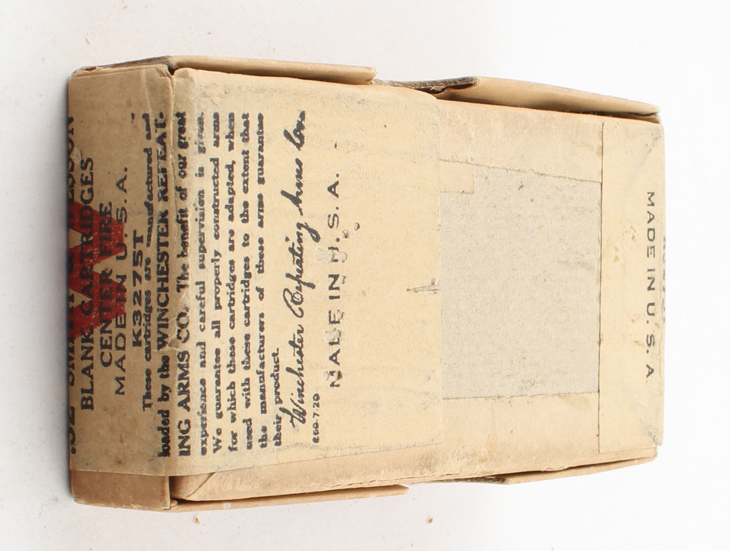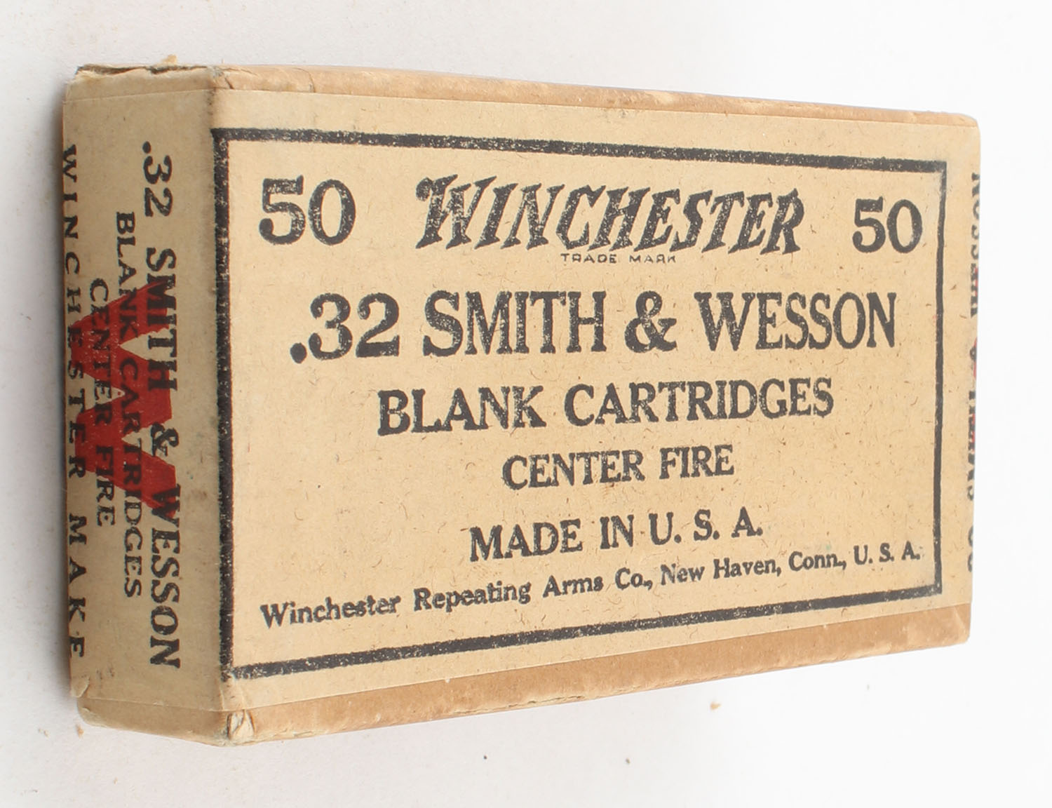 Winchester, Blank Cartridges, .32 Smith & Wesson, FULL & SEALED, 2pc. Buff box with buff wraparound label, box is solid with excellent color, very minor age soiling, corners are mostly sharp, edges are crisp, label is intact. Grade: Excellent ++ - Value: 8 to 40