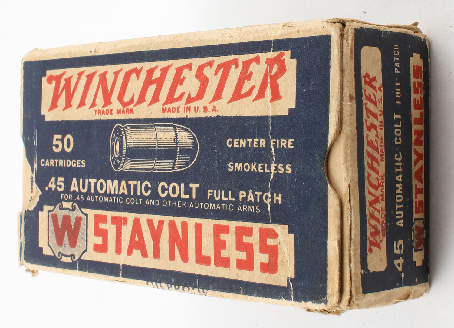 Winchester, Non-Mercuric Staynless, .45 Auto Colt, Full, 1pc., Blue white & red box, box is solid with very good color, has light age soiling, some edge & corner wear, end flaps are solid, ammo is very good. Grade: Very Good ++ - Value: 20 to 80