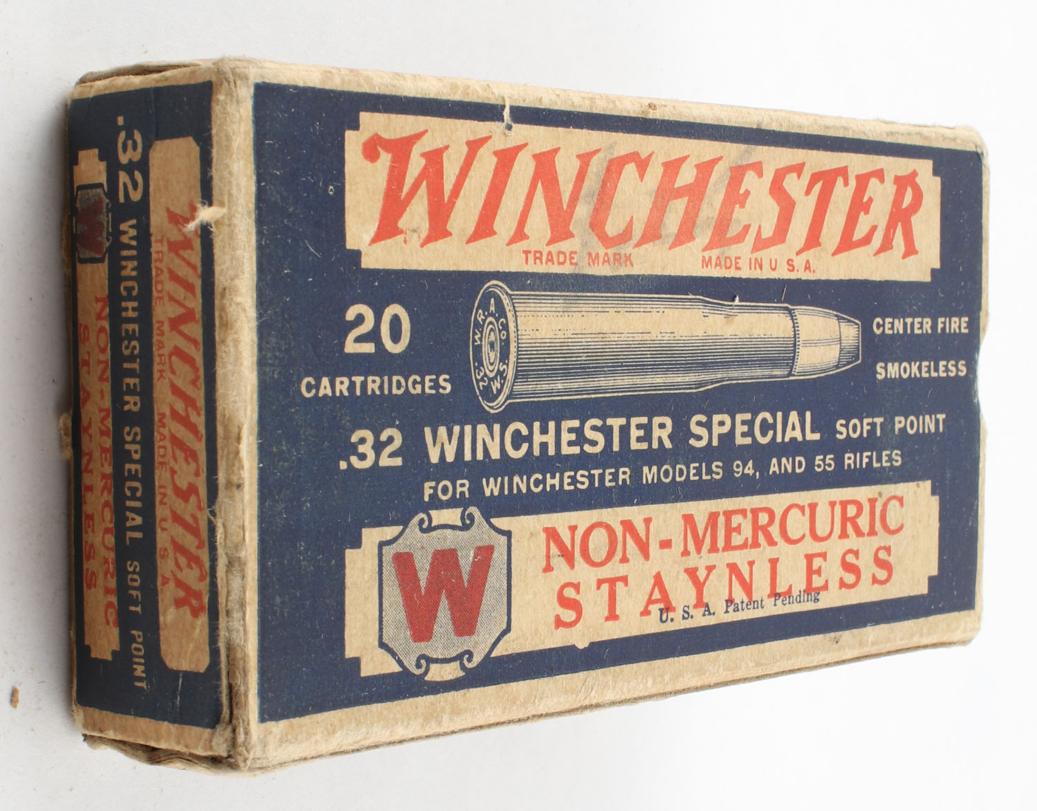Winchester, Non-Mercuric Staynless, .32 Winchester Special, Soft Point, Partial 16rds., 1pc., Blue white & red box, box is solid with good color, has some age soiling with edge & corner wear, end flaps are solid, ammo is very good. Grade: Very Good - Value: 40 to 60