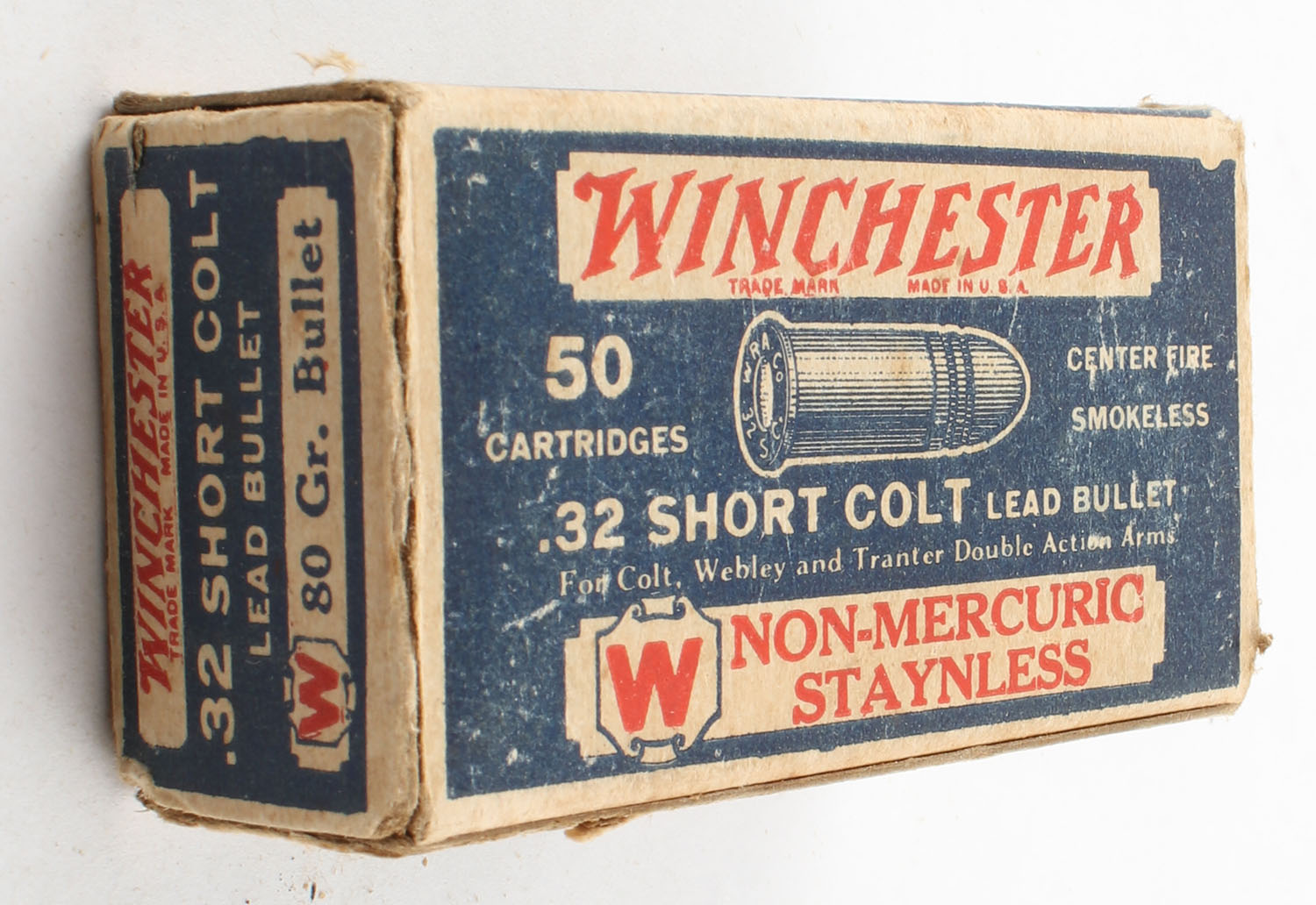 Winchester, Non-Mercuric Staynless, .32 Short Colt, Oilproof, Full, 1pc. Blue white & red box with ''Oilproof'' over-stamp, box is solid with great color, has light scuffing with edge wear, end flaps are torn, ammo is excellent. Grade: Very Good - Value: 40 to 120