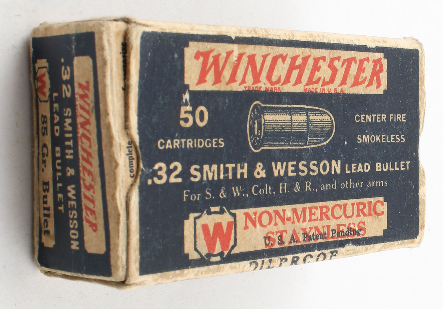 Winchester, .32 Smith & Wesson, Non-Mercuric, Staynless, Oil Proof, Full of mixed ammo, 85 Grain Lead Bullet, 1pc., Blue white & red box, box is solid with very good color, has rub marks with light edge & corner wear, right end flap is torn, left end flap has tape repair on inside, ammo is very good. Grade: Good + - Value: 20 to 60