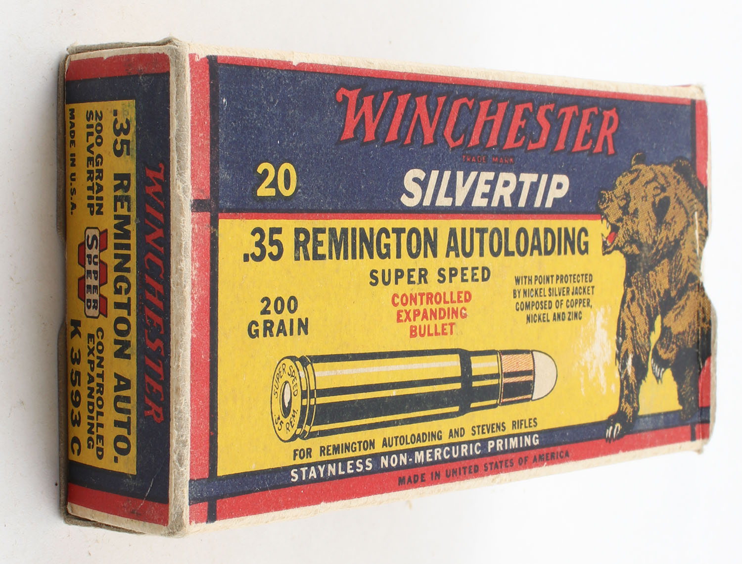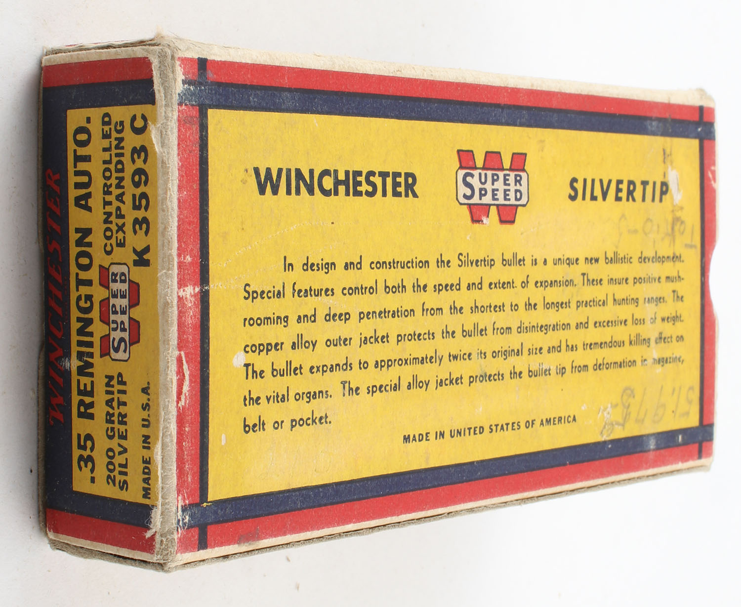 Winchester, Silvertip, .35 Remington Autoloading, 200 Grain Controlled Expanding Bullet, Full with 13rds. Being correct, 1pc., Yellow blue & red bear box, box is solid with great colors, has light scuffing with light edge & corner wear, end flaps are solid, ammo is very good. Grade: Very Good ++ - Value: 30 to 90