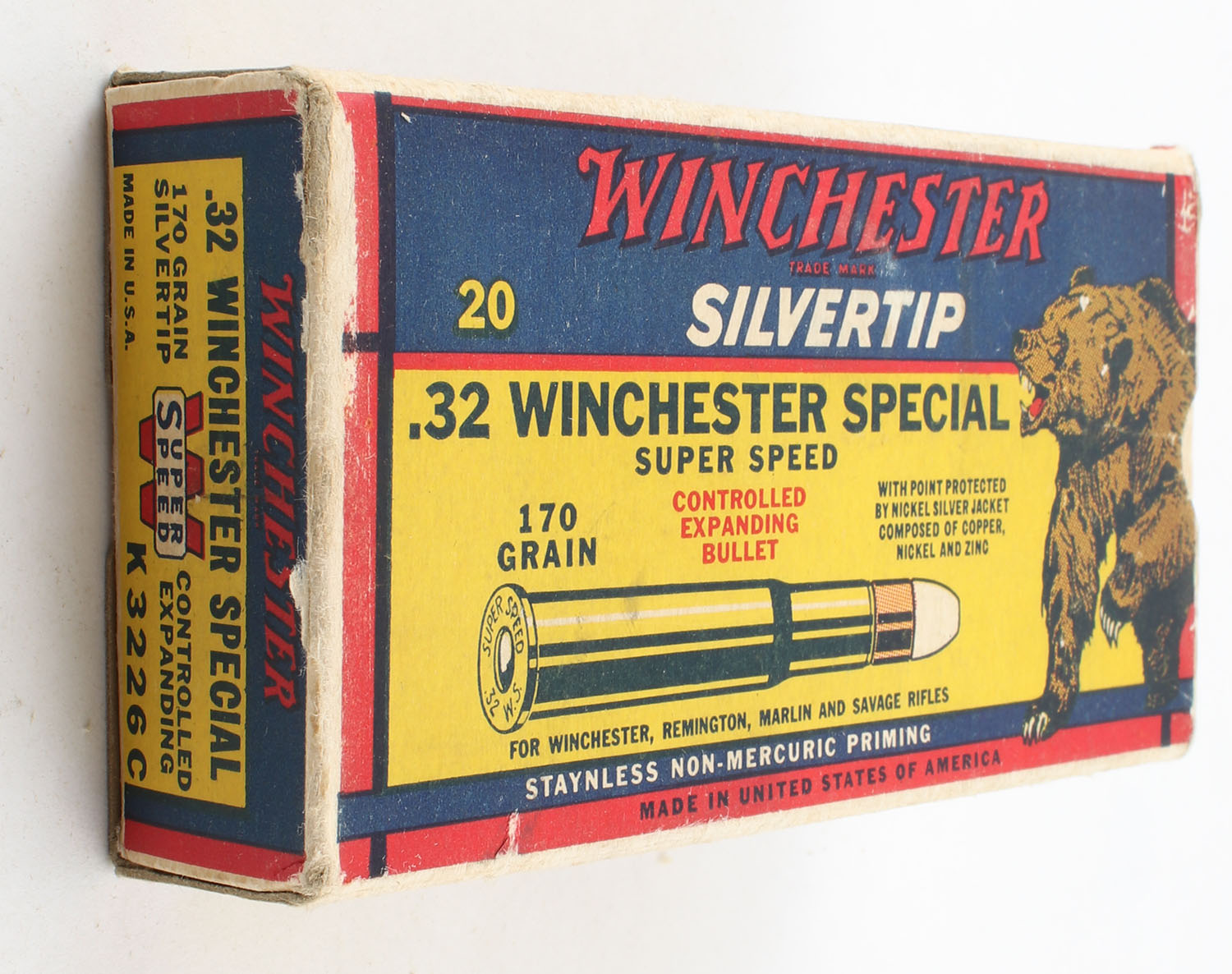 Winchester, Silvertip, .32 Winchester Special, 170 Grain Controlled Expanding Bullet, Full, 1pc., yellow blue & red bear box, box is solid with excellent color, box has light edge & corner wear, end flaps are solid, ammo is very good. Grade: Excellent - Value: 80 to 200