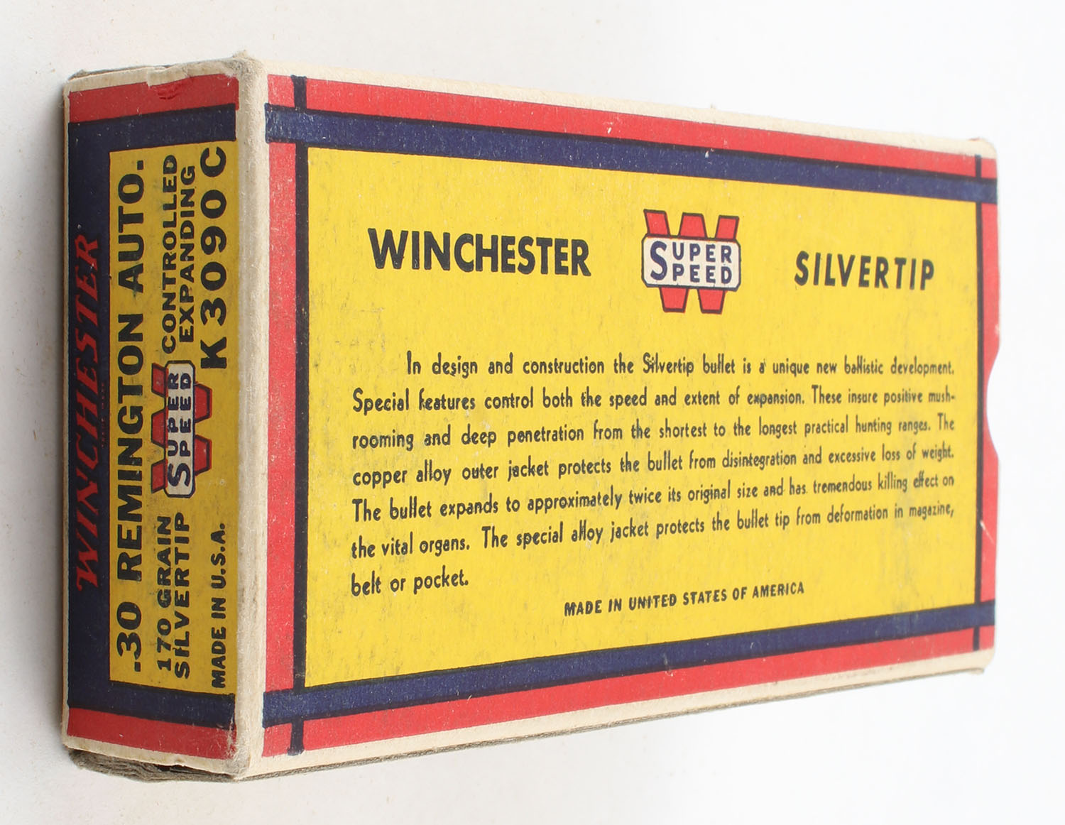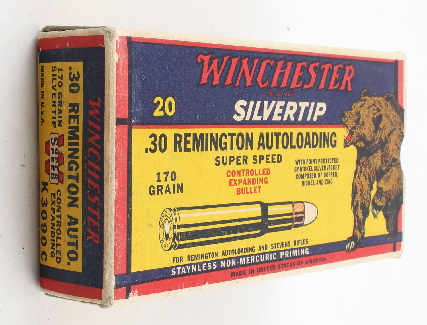 Winchester, Silvertip, .30 Remington Autoloading, 170 Grain Controlled Expanding Bullet, Full, 1pc., Yellow blue & red bear box, box is very solid with excellent color, end flaps are solid, ammo is excellent. Grade: Excellent + - Value: 100 to 300