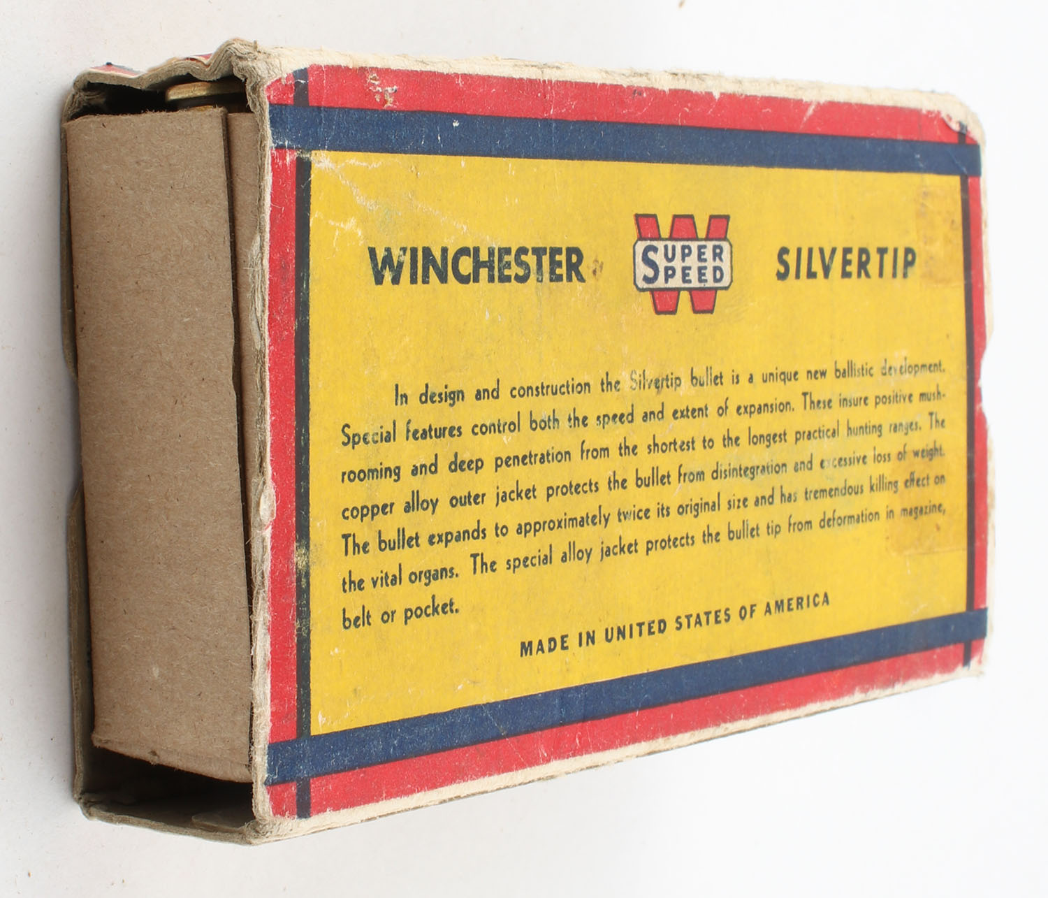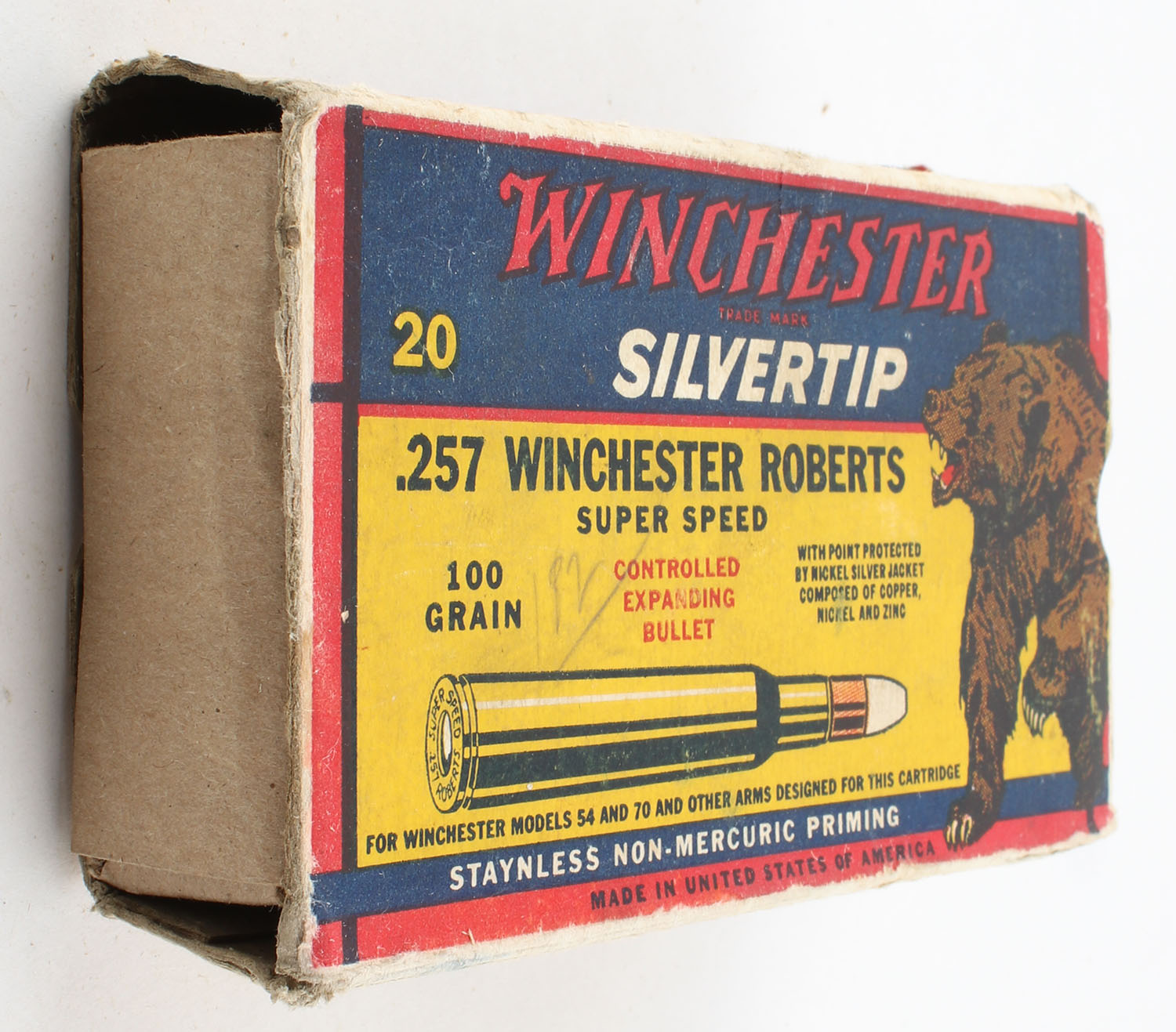 Winchester, Silvertip, .257 Winchester Roberts, 100 Grain Controlled Expanding Bullet, Empty (13rds. Of fired brass), 1pc. Yellow blue & red bear box, box is missing both end flaps, has corner & edge wear, box has great color. Grade: Good ++ - Value: 10 to 30