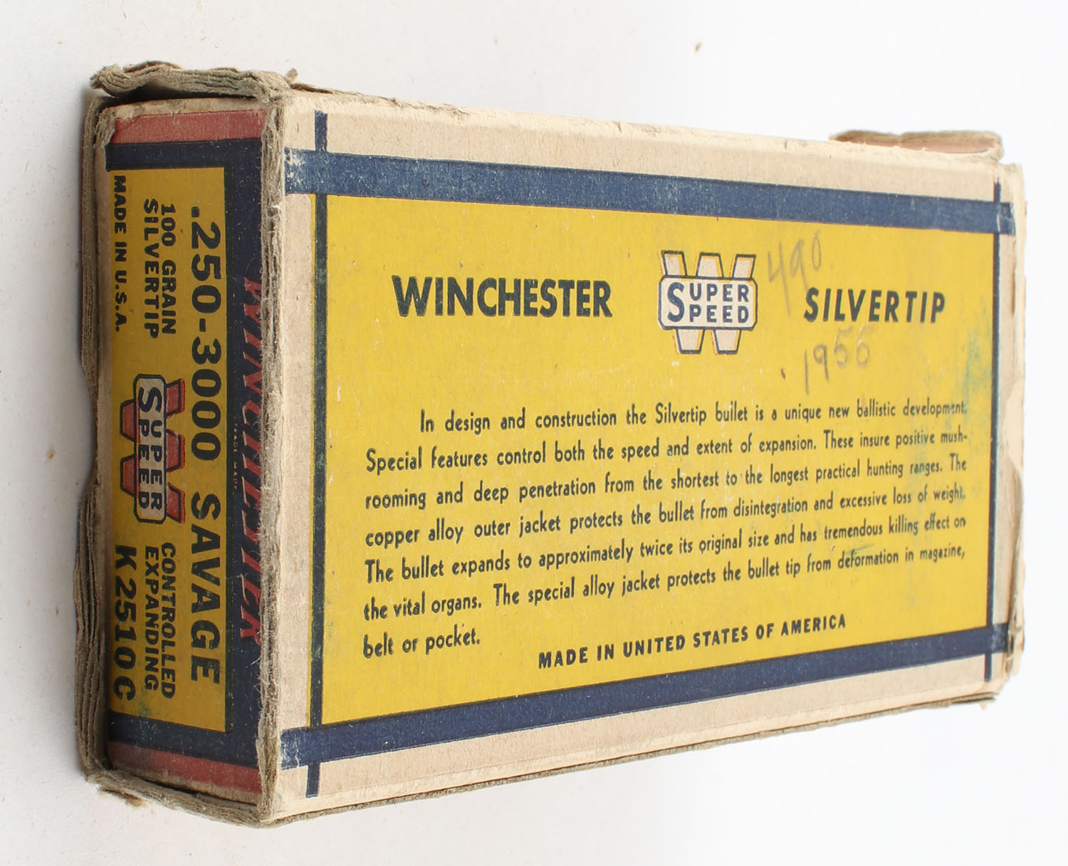 Winchester, Silvertip, .250-3000 Savage, 100 Gr. Controlled Expanding Bullet, Super Speed, 1pc, Partial 19rds with 16rds. Being correct, yellow blue & red bear box, box has edge & corner wear, has a torn right end flap, ammo is very good. Grade: Good ++ - Value: 50 to 75