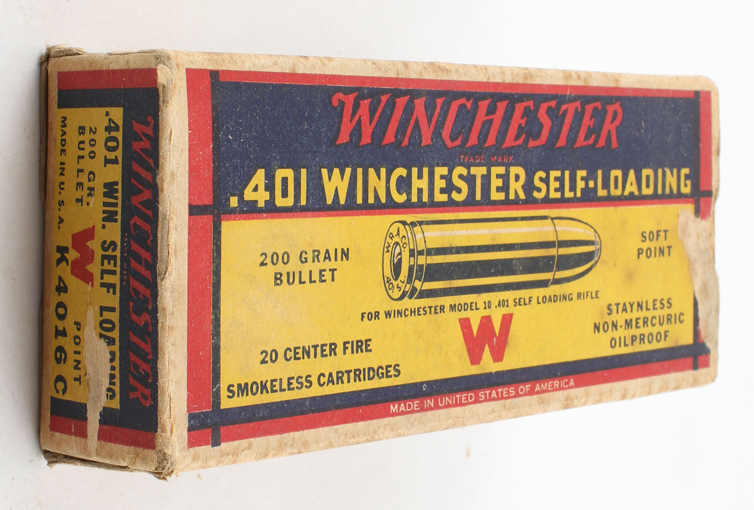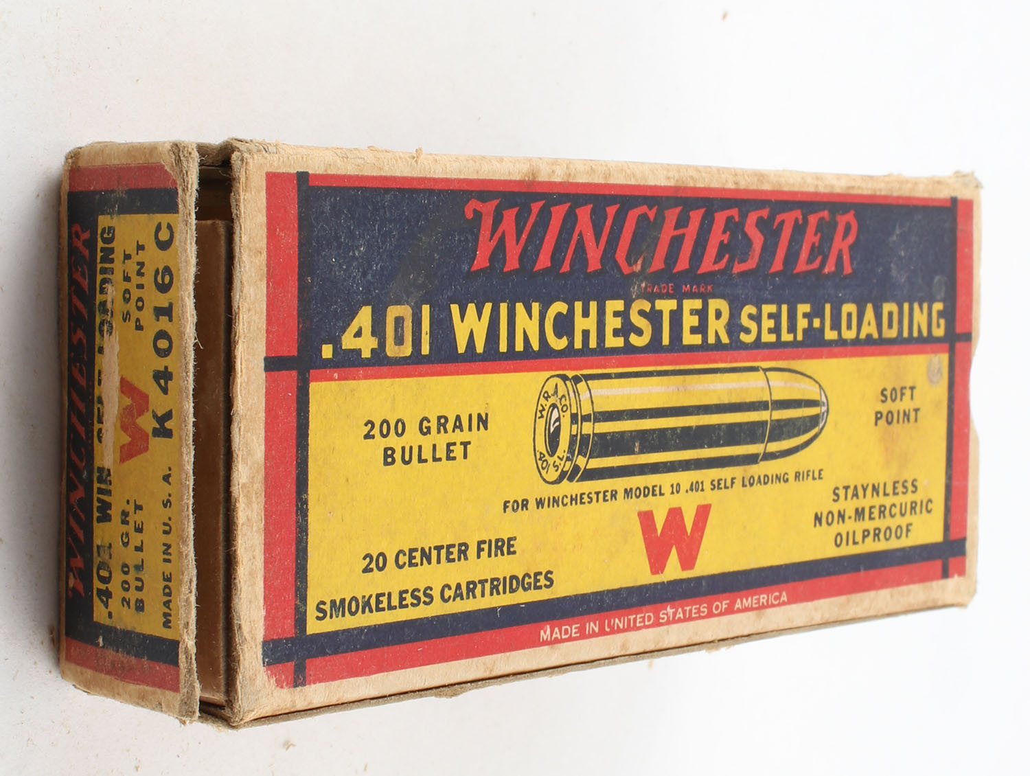 Winchester, .401 Winchester Self-Loading, 200 Grain Soft Point Bullet, Full, 1pc. Yellow blue & red box, box has light age soiling with great color, right end flap is torn, left end flap is solid, ammo is very good. Grade: Very Good - Value: 50 to 150