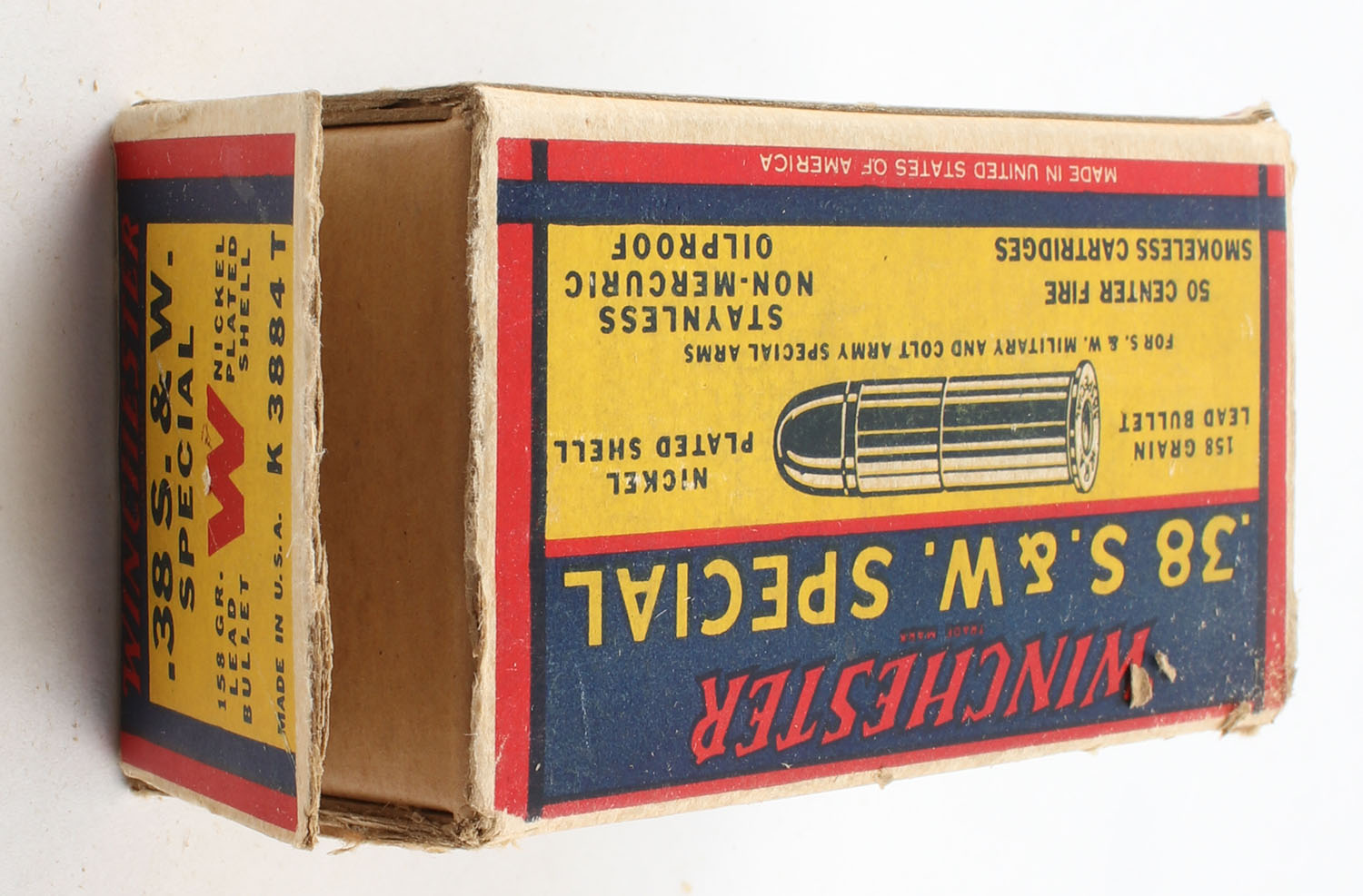 Winchester, .38 Smith & Wesson Special, 158 Grain Lead Bullet, Nickel Plated Shell, Full, 1pc. Yellow blue & red box, box is solid with excellent color, very minor shelf wear, end flaps are torn, ammo is excellent. Grade: Very Good ++ - Value: 50 to 150