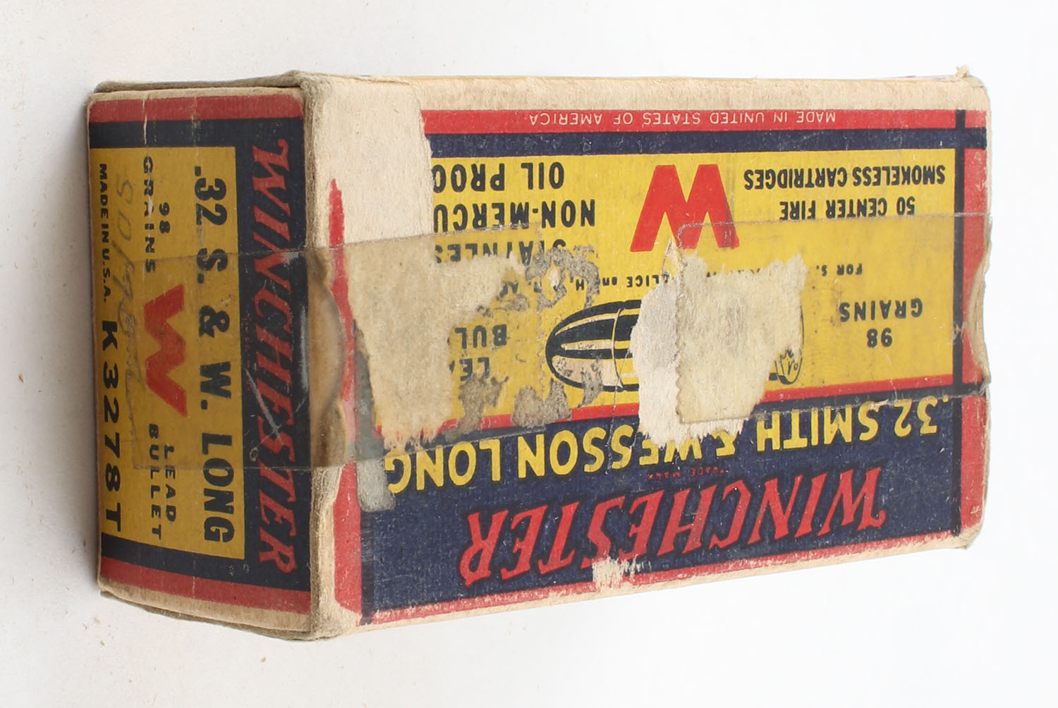 Winchester, Smokeless Cartridges, .32 Smith & Wesson Long, 98 Grains Lead Bullet, Full, 1pc. Yellow blue & red box, box has light age soiling with great color, has scuffing with tape on one side, end flaps are solid, ammo is excellent. Grade: Very Good + - Value: 20 to 60