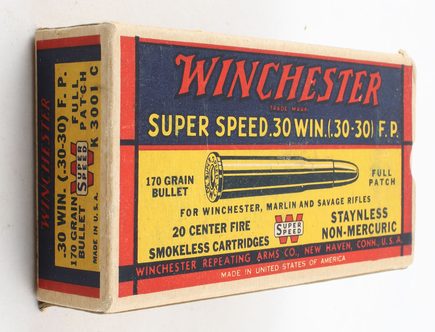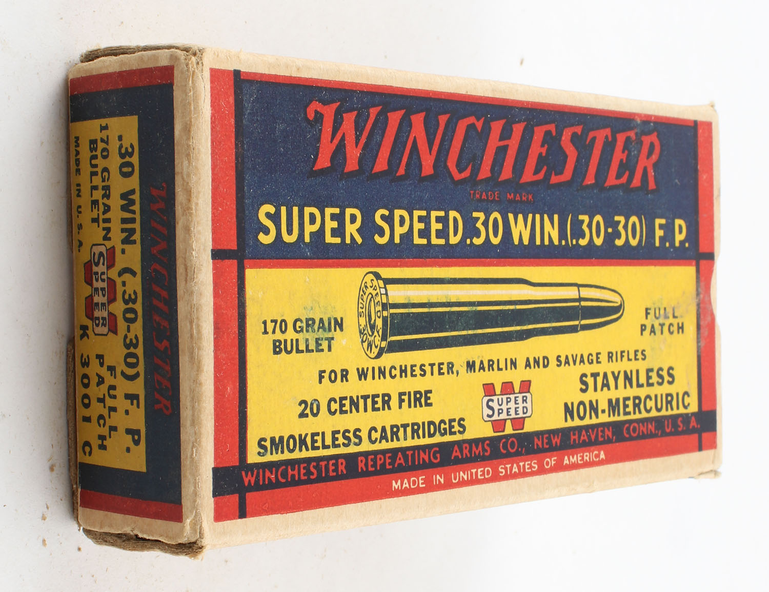 Winchester, Super Speed, .30 Winchester (.30-30), 170 Grain Full Patch, Full, 1pc. Yellow blue & red box, box is solid with excellent color, very minor age soiling, some corner wear, end flaps are solid, ammo is excellent. Grade: Excellent + - Value: 60 to 180