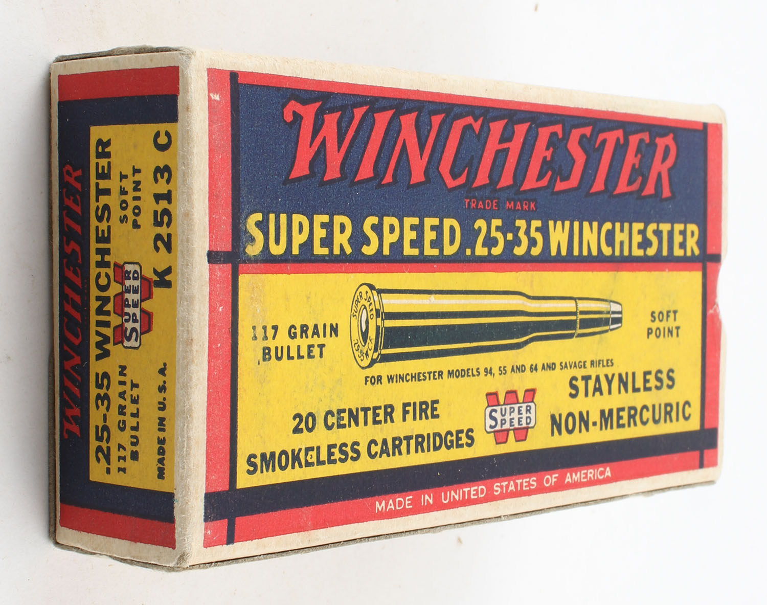 Winchester, Super Speed, .25-35 Winchester, 117 Grain Soft Point Bullet, Full, 1pc. Yellow blue & red box, box is solid with excellent color, very minor scuffing, end flaps are solid, ammo is excellent. Grade: Excellent + - Value: 60 to 90