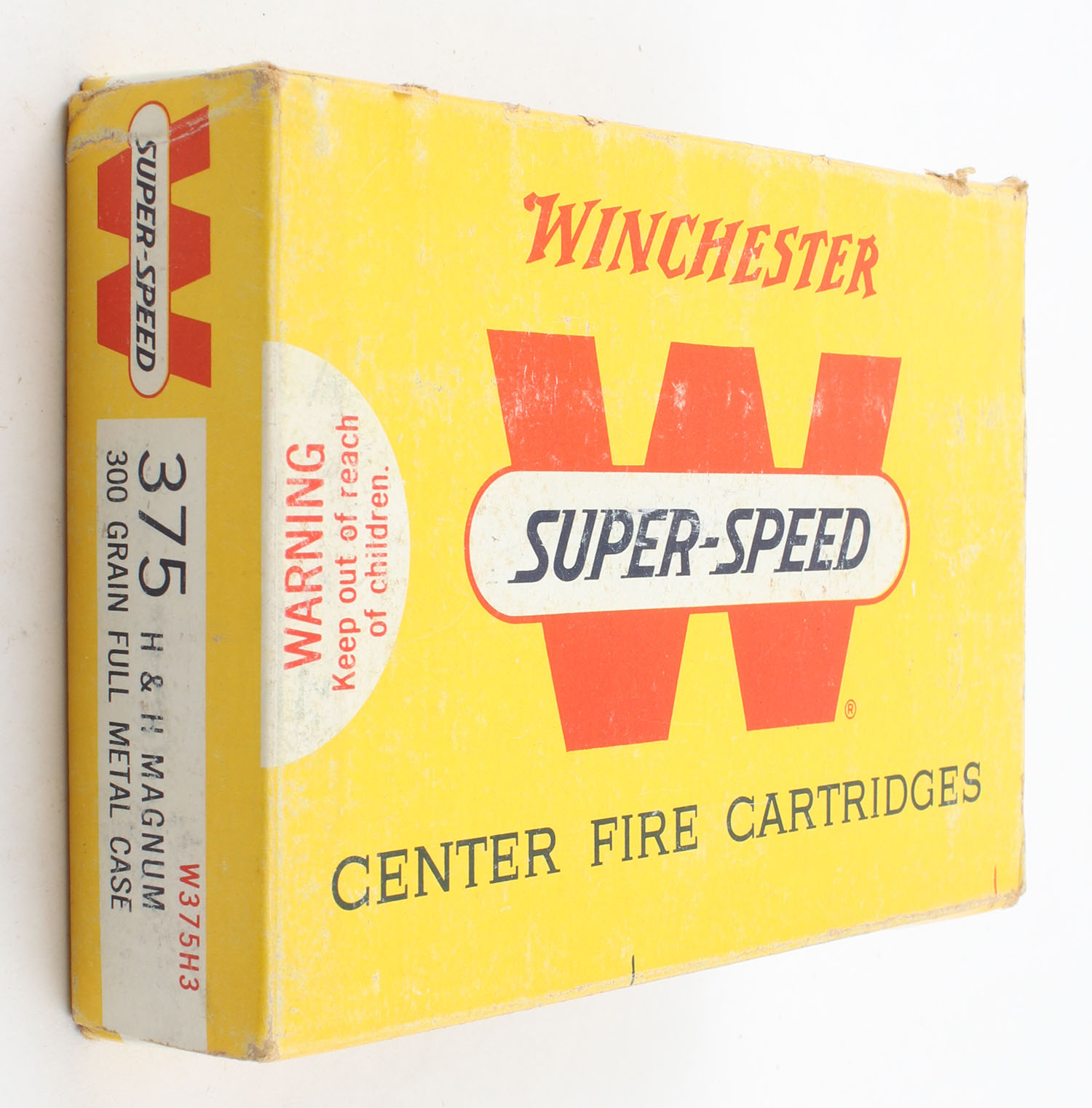 Winchester, Super Speed, 375 H&H Magnum, 300 Grain Full Metal Case, Full, 1pc., Yellow Red & white box, box has light scuffing with edge & corner wear, has great color, end flaps are solid, ammo is excellent. Grade: Very Good - Value: 40 to 80