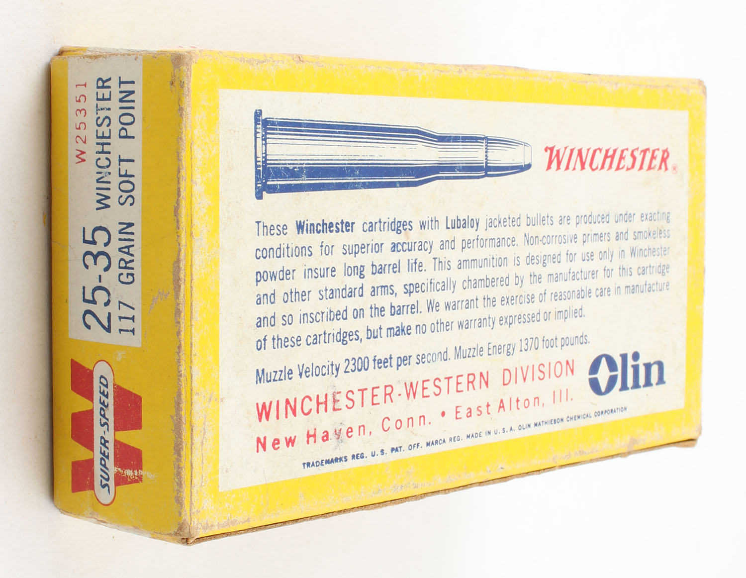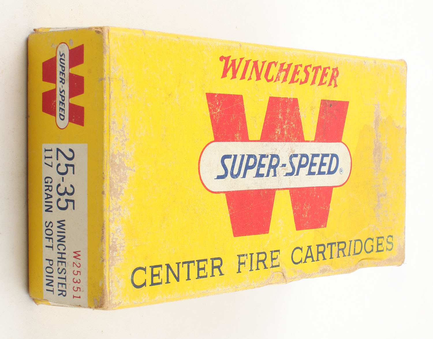 Winchester, Super-Speed, .25-35 Winchester, 117 Grain Soft Point, Full, 1pc. Yellow white & red box, box has scuffing with edge & corner wear, end flaps are solid, ammo is excellent. Grade: Very Good ++ - Value: 50 to 150