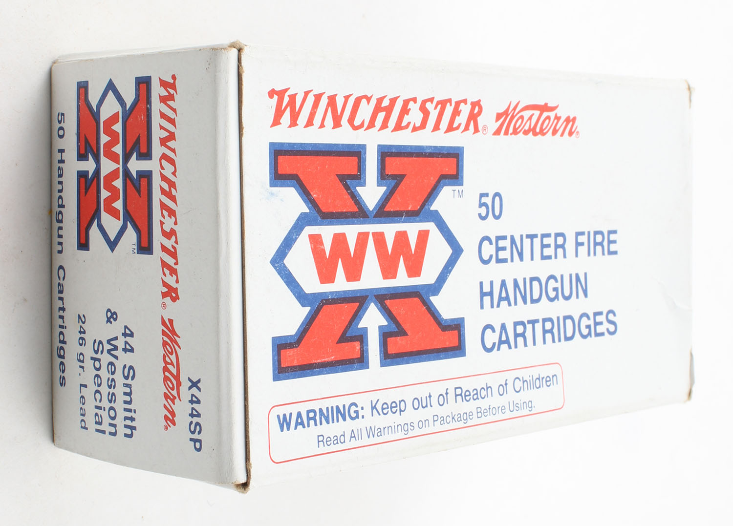 Winchester-Western, X, .44 Smith & Wesson Special, 246 Grain Lead, Partial 30rds., 1pc., White red & black box, box is very solid with excellent color, very minor corner wear, edges are crisp, end flaps are solid, ammo is excellent. Grade: Excellent - Value: 30 to 60