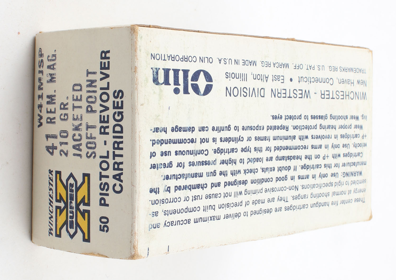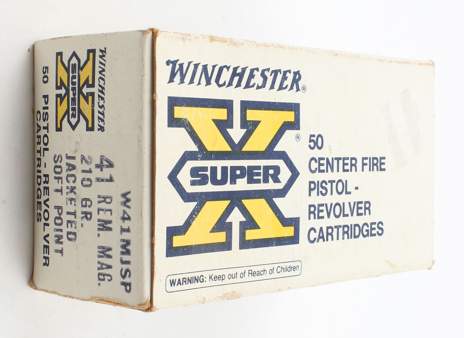 Winchester, Super-X, .41 Remington Magnum, 210 Grain Jacketed Soft Point, Full, 1pc., White black & yellow box, box is solid with great color, has light edge & corner wear with, end flaps are solid, ammo is excellent. Grade: Excellent - Value: 40 to 100