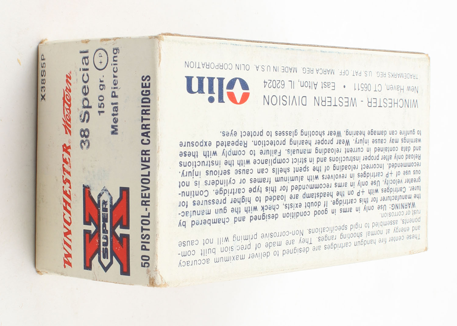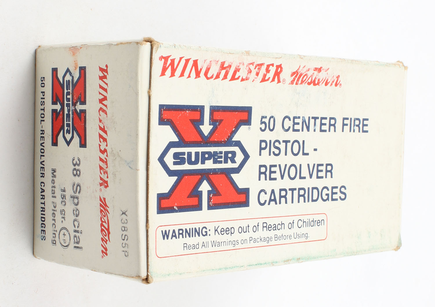 Winchester-Western, Super X .38 Special, 150 Grain +P Metal Piercing, Full, 1pc., White red & blue box, box is solid with very good color, has light scuffing & edge wear, end flaps are solid, ammo is minty. Grade: Excellent - Value: 40 to 60