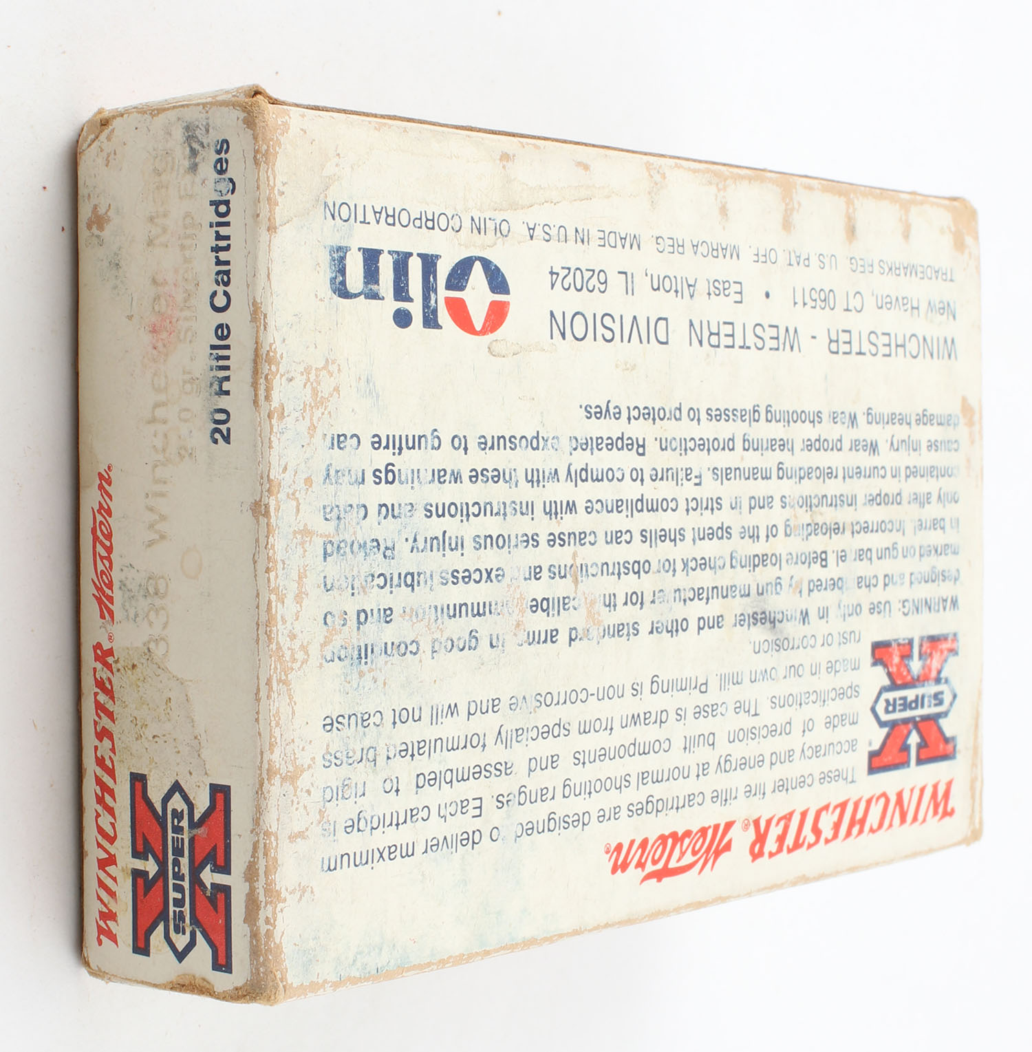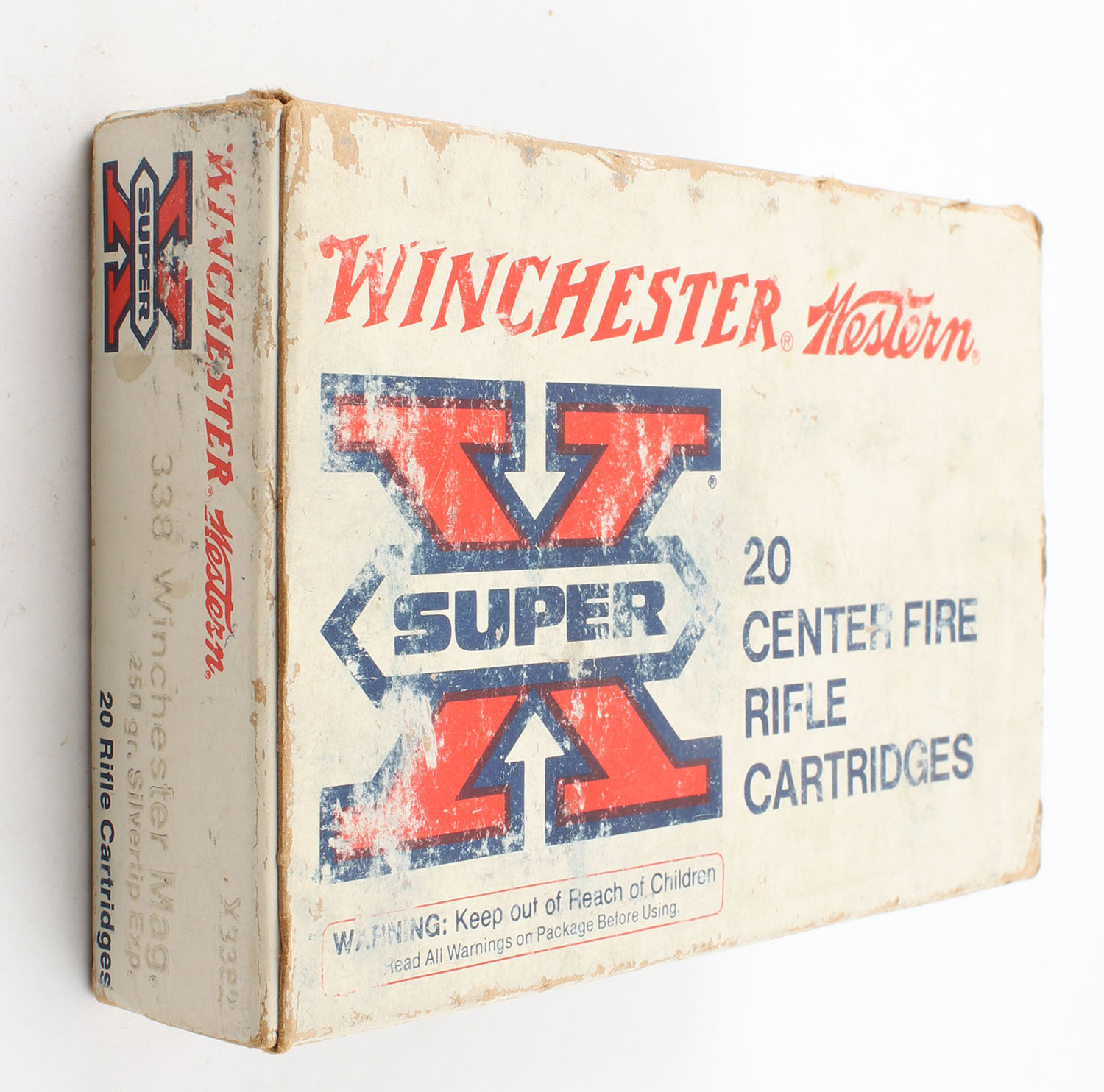 Winchester-Western, Super X, .338 Winchester Magnum, 250 Grain Silvertip Exp., Full, 1pc., White red & blue box, box has scuffing & age soiling, edge & corner wear, end flaps are solid, ammo is excellent. Grade: Very Good - Value: 60 to 90