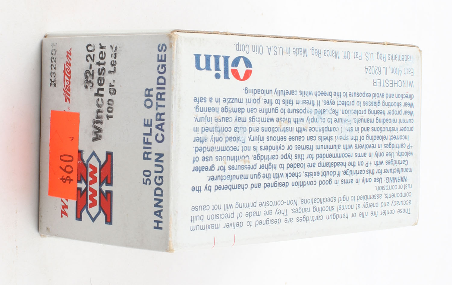 Winchester-Western, X, .32-20 Winchester, 100 Grain Lead, Full, 1pc., White red & blue box, box is solid with very good color, has light scuffing, corners are mostly sharp, edges are mainly crisp, end flaps are solid, ammo is minty. Grade: Excellent - Value: 100 to 150