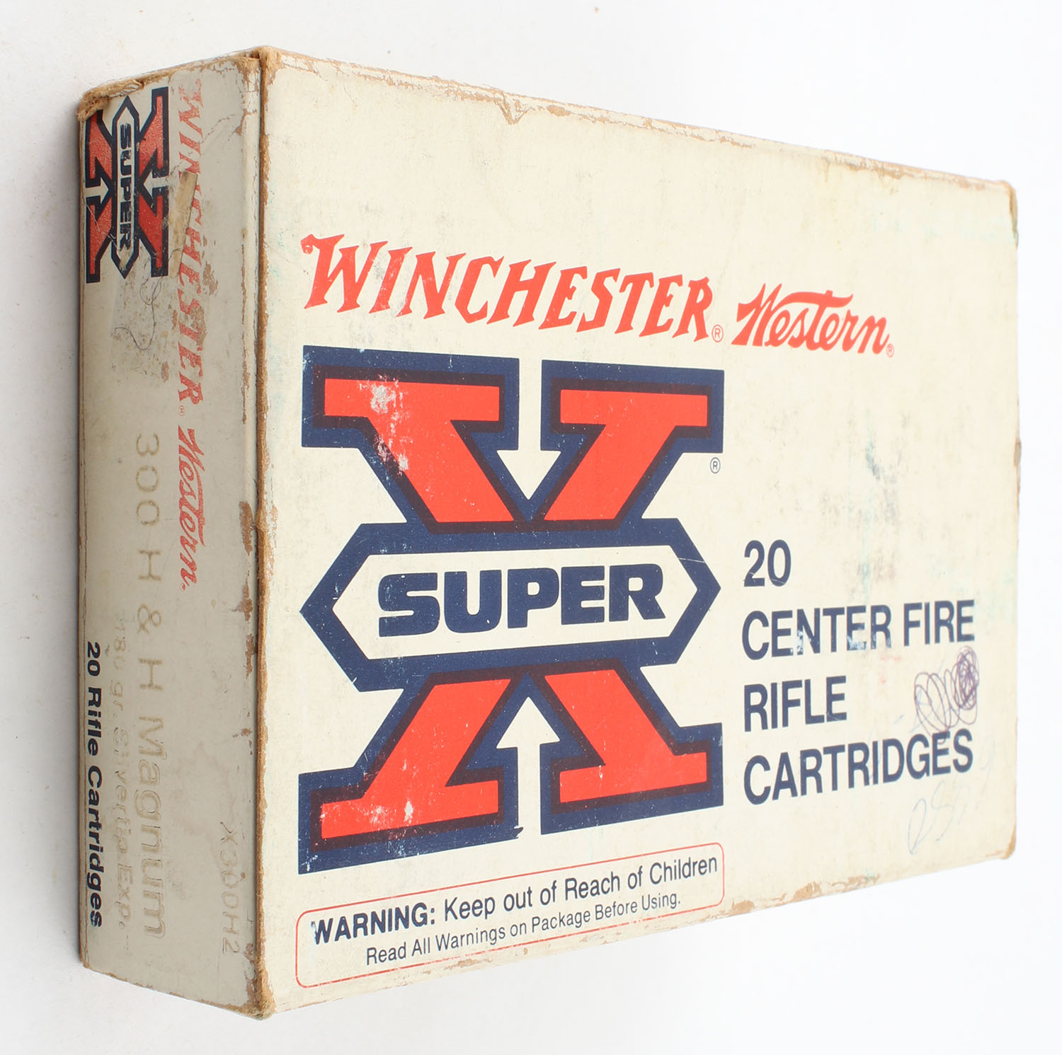 Winchester-Western, .300 H&H Magnum, 180 Grain Silvertip Exp., Partial 17rds., 1pc., White red & blue box, box has light age soiling with good color, has edge & corner wear, end flaps are solid, ammo is excellent. Grade: Very Good - Value: 30 to 90