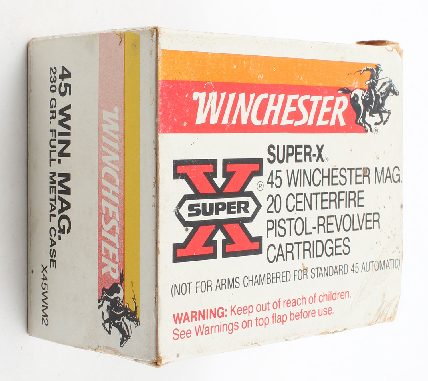 Winchester, Super X, .45 WIN. MAG., 230 Grain Full Metal Case, Full, 1pc., Multi-colored box, box is solid with good color, box has light age soiling & scuffing, end flaps are solid, ammo is excellent. Grade: Very Good ++ - Value: 20 to 30
