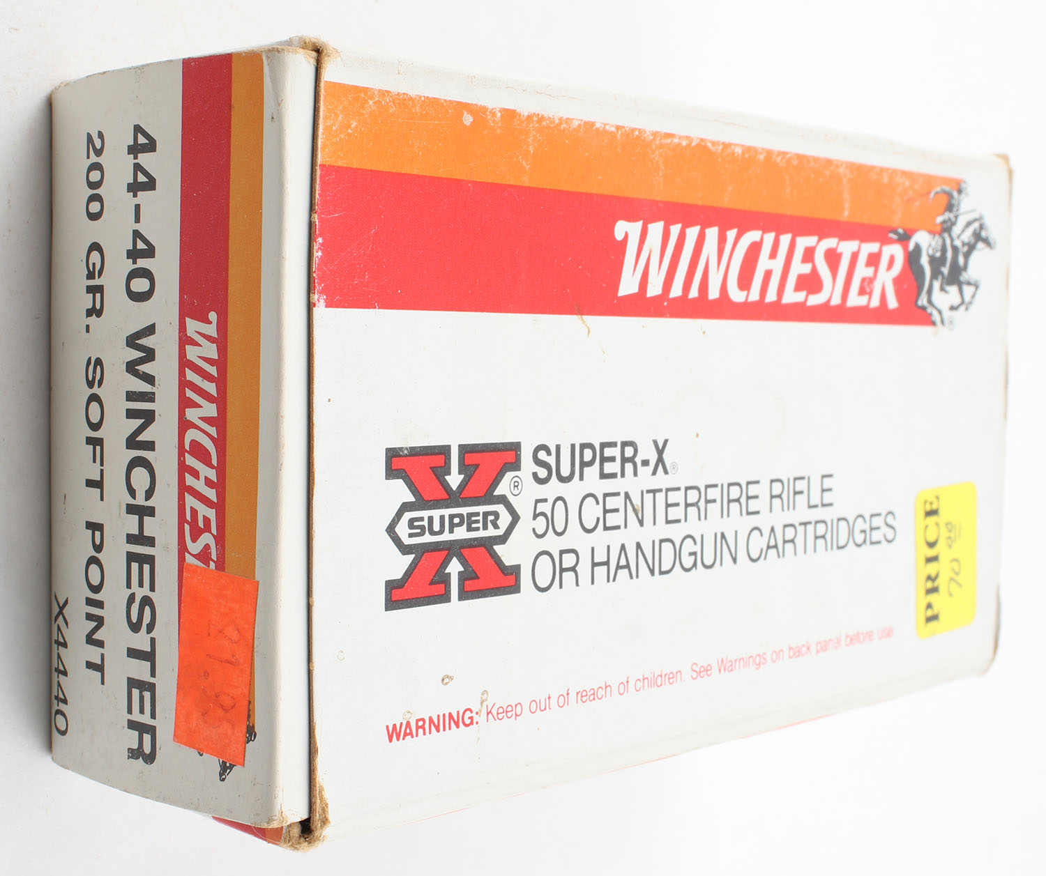 Winchester, Super-X, .44-40 Winchester, 200 Grain Soft Point, Full, 1pc., Multi-colored box, box has light edge & corner wear, end flaps are solid, ammo is excellent. Grade: Excellent - Value: 40 to 100