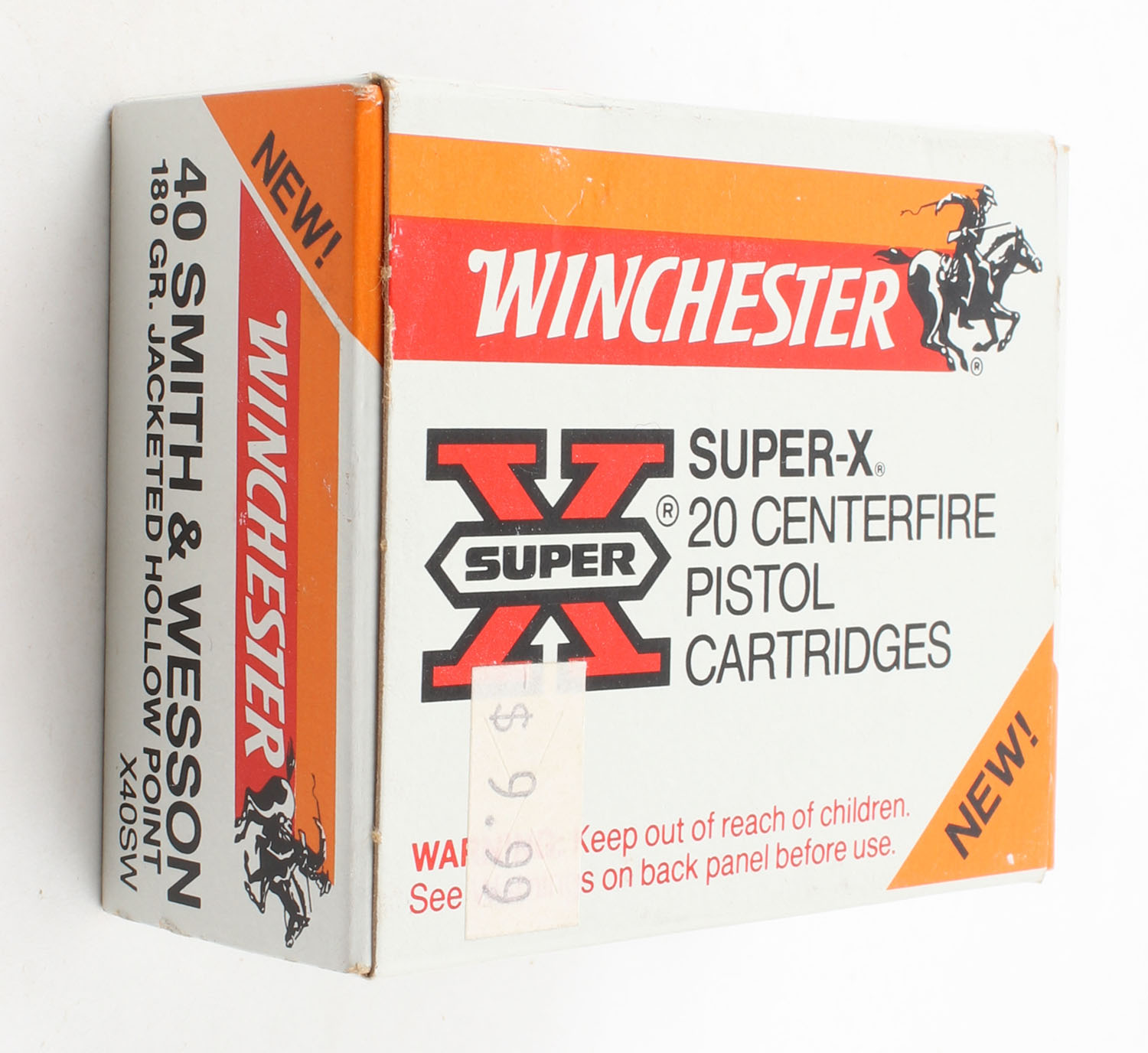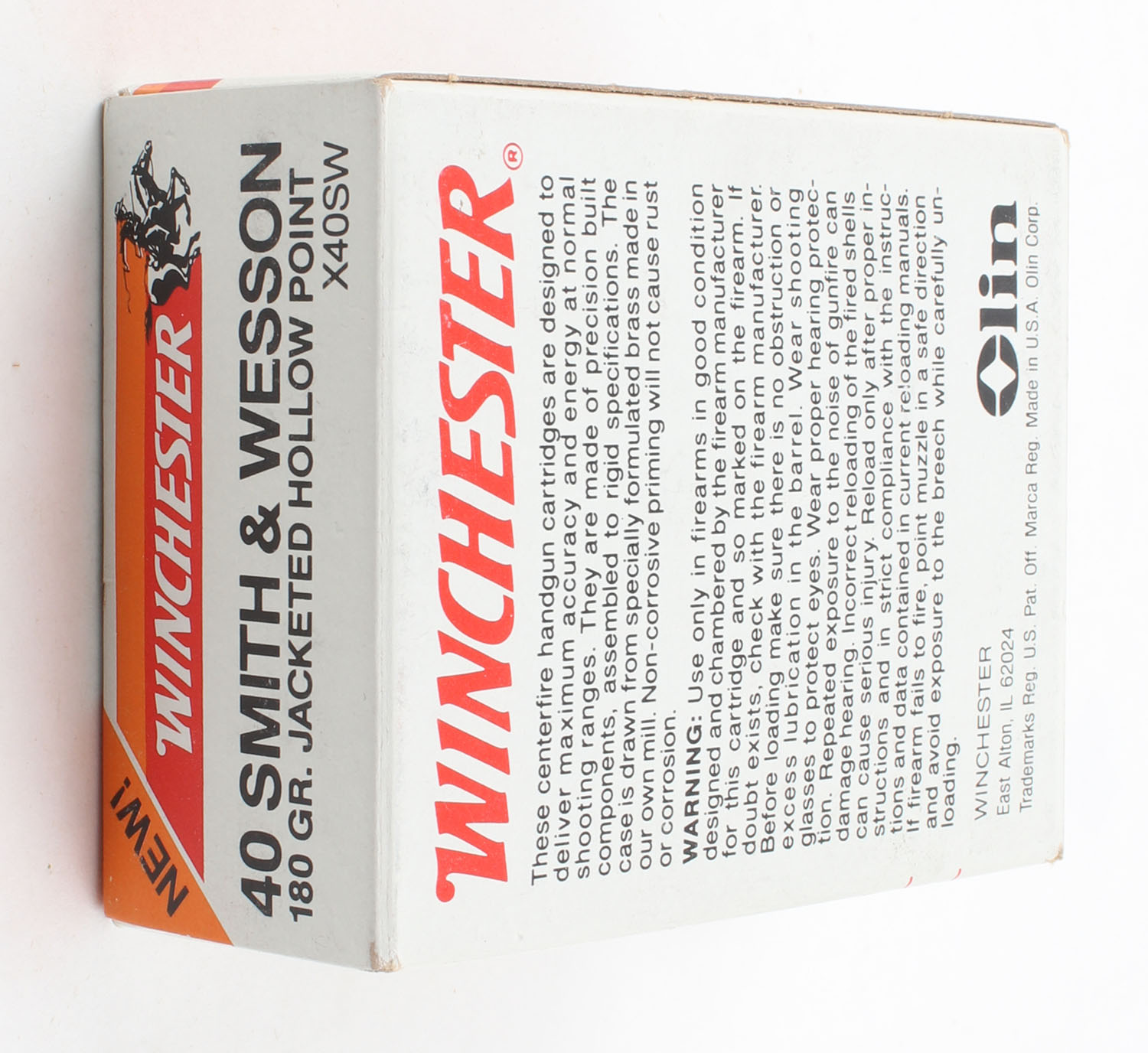 Winchester, Super-X, .40 Smith & Wesson, 180 Grain Jacketed HP, Full, 1pc., Multi-colored box, box is very solid with excellent color, corners are sharp, edges are crisp, end flaps are solid, ammo is excellent. Grade: Excellent ++ - Value: 20 to 60
