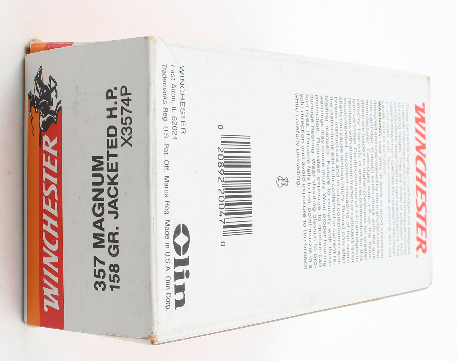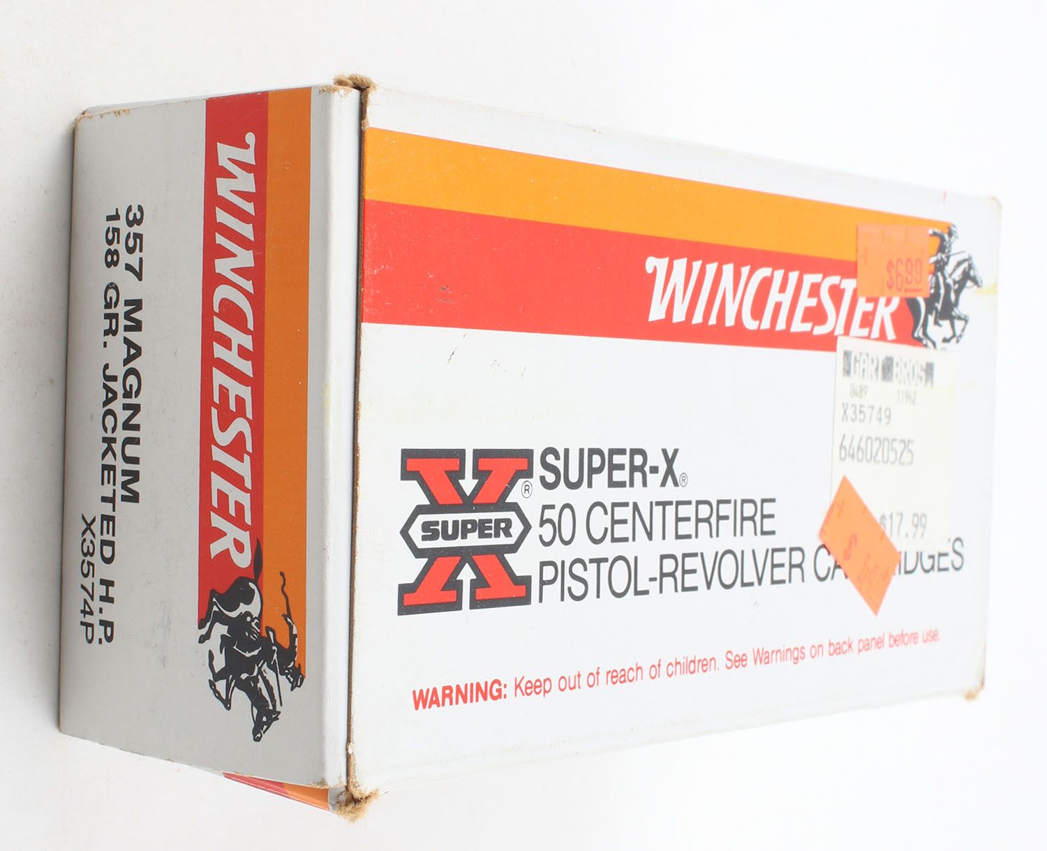 Winchester, Super-X, .357 Magnum, 158 Grain Jacketed H.P., Full, 1pc., White red & orange box, box is solid with excellent color, has stickers to front, has minor corner wear, end flaps are solid, ammo is minty. Grade: Excellent - Value: 20 to 60
