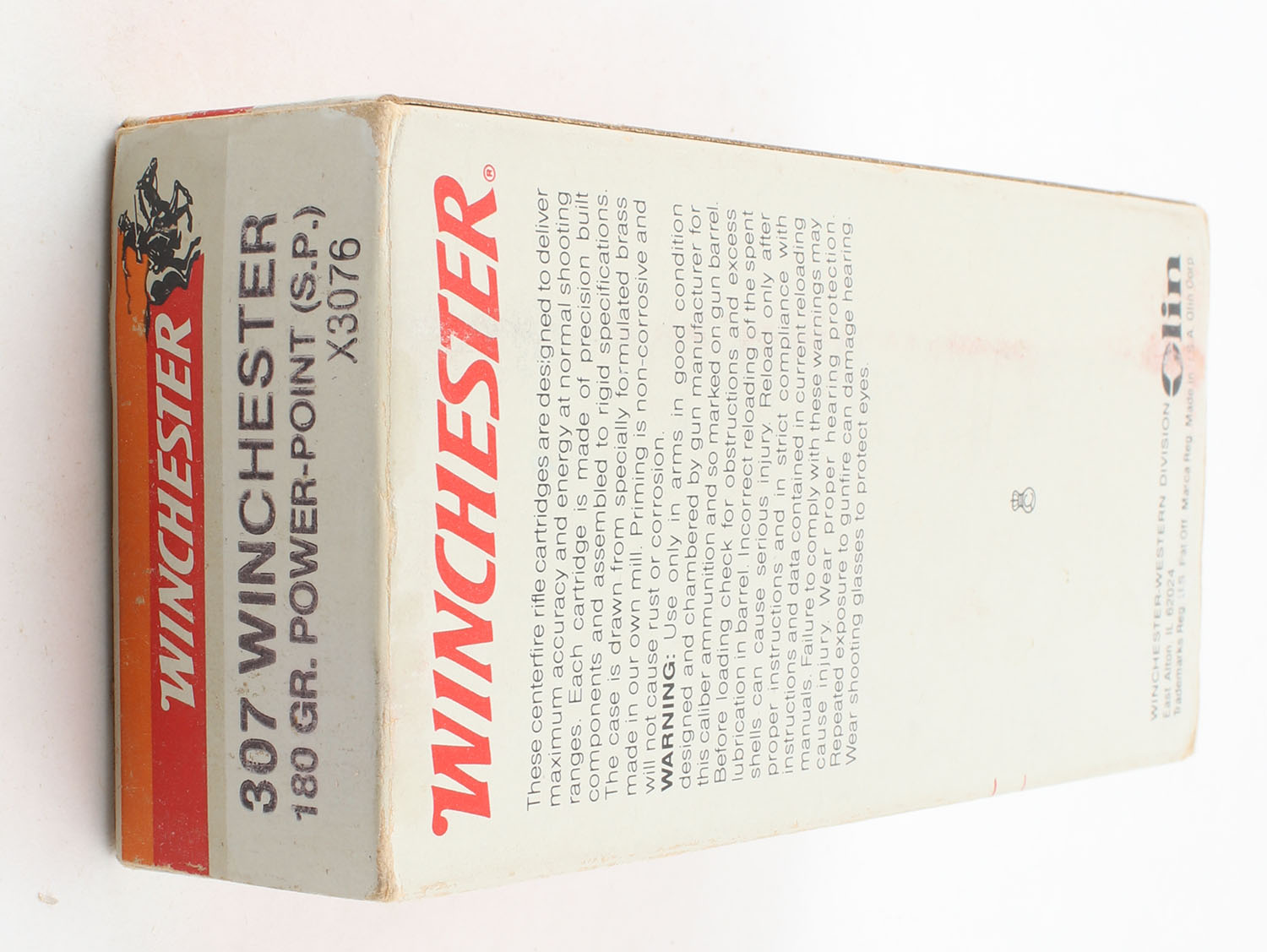 Winchester, Super-X, .307 Winchester, 180 Grain Power-Point (S.P.), Full, 1pc. Grey red & orange box, box is solid with very color, has light scuffing with edge & corner wear, end flaps are solid, ammo is excellent. Grade: Very Good ++ - Value: 20 to 50
