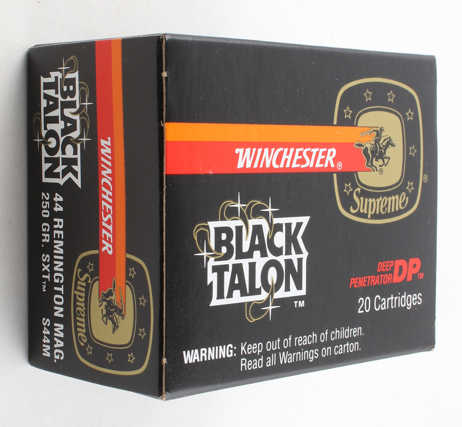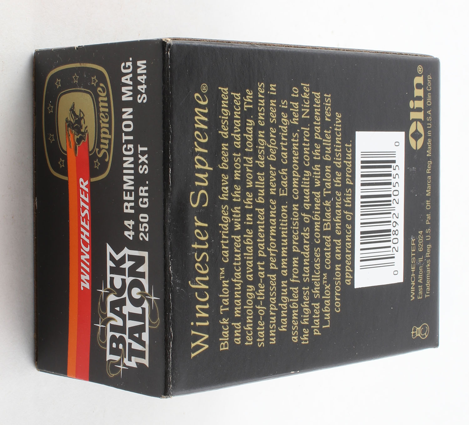 Winchester, Black Talon, .44 Remington Magnum, 250 Gr. SXT, Full, 1pc. Black red & orange box, box is MINT with minty color, corners are sharp, edges are crisp, end flaps are solid, ammo is minty. Grade: MINT - Value: 30 to 90