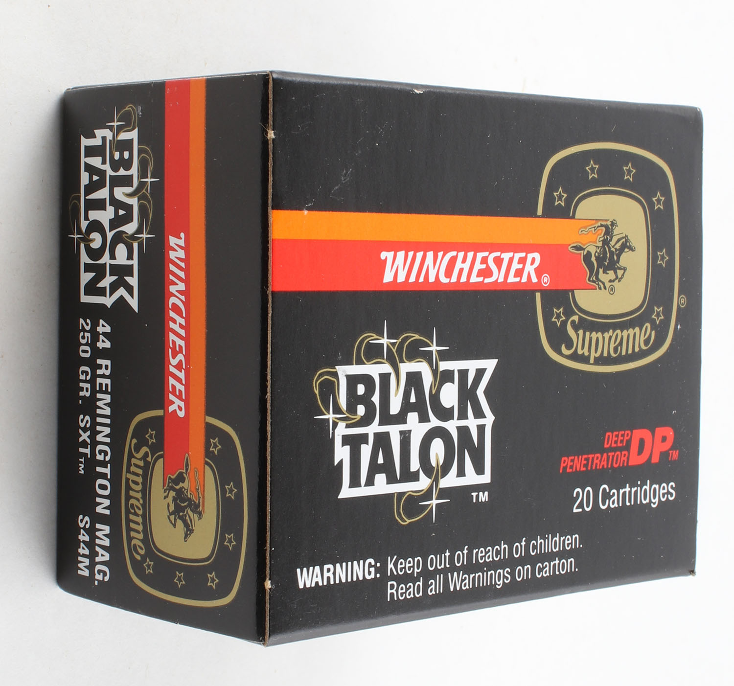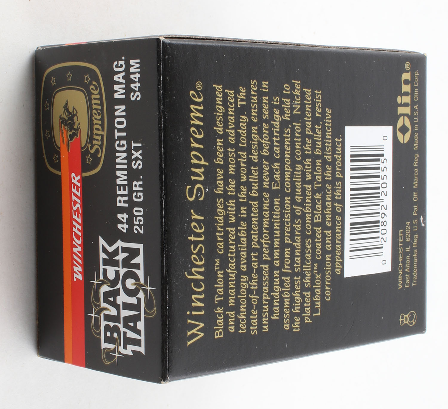 Winchester, Black Talon, .44 Remington Magnum, 250 Gr. SXT, Full, 1pc. Black red & orange box, box is MINT with minty color, corners are sharp, edges are crisp, end flaps are solid, ammo is minty. Grade: MINT - Value: 30 to 90