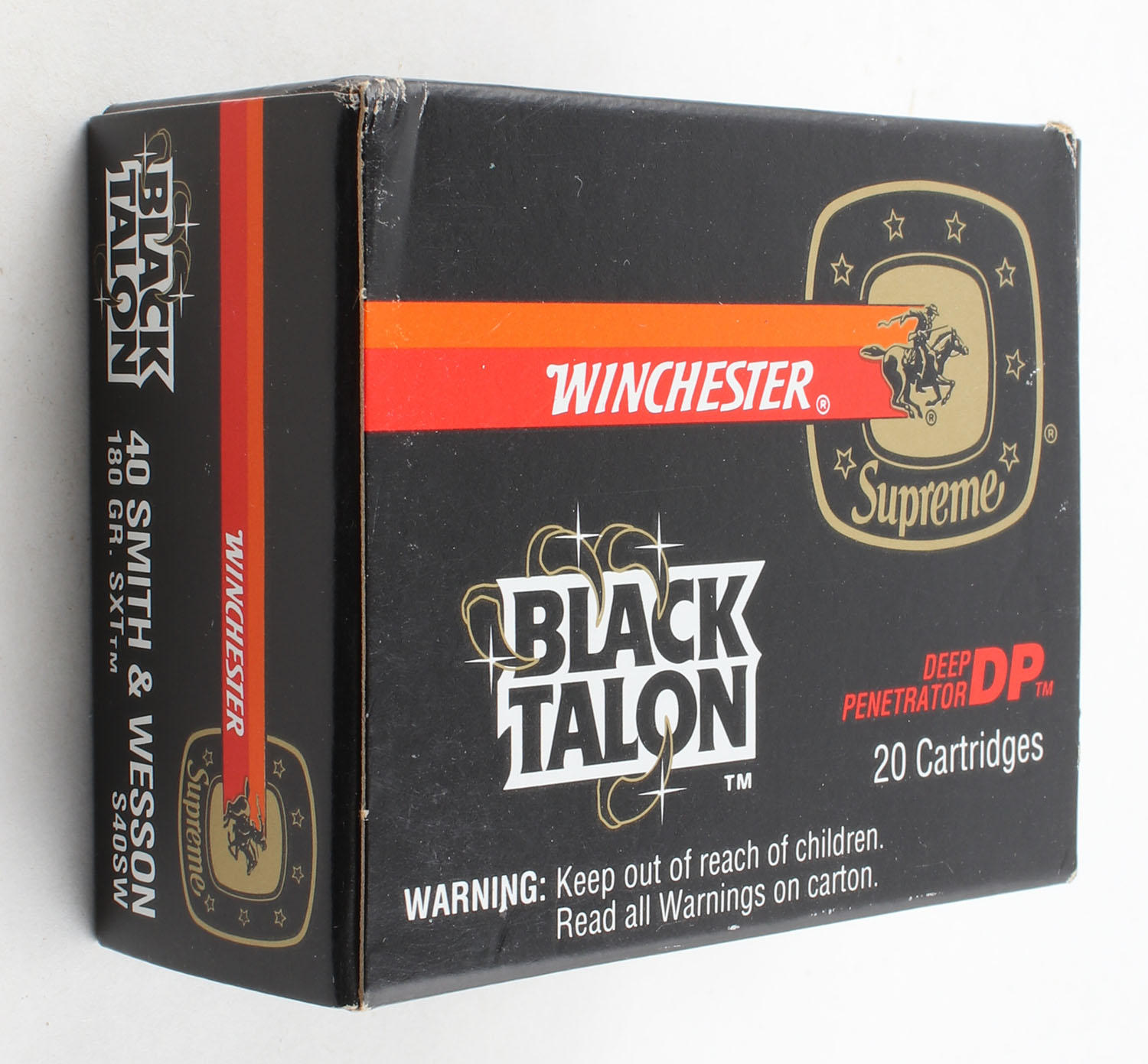 Winchester, Black Talon, .40 Smith & Wesson Hollow Point, 180 Grain SXT, Full, 1pc. Black box, box is solid with minty color, minor corner wear, end flaps are solid, ammo is excellent. Grade: Excellent + - Value: 40 to 100