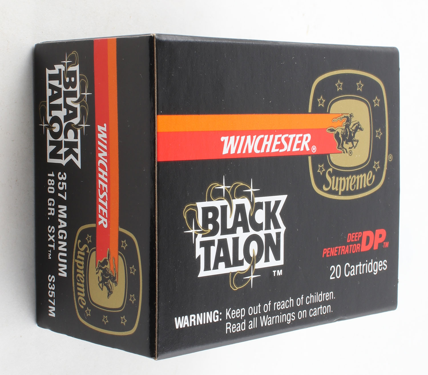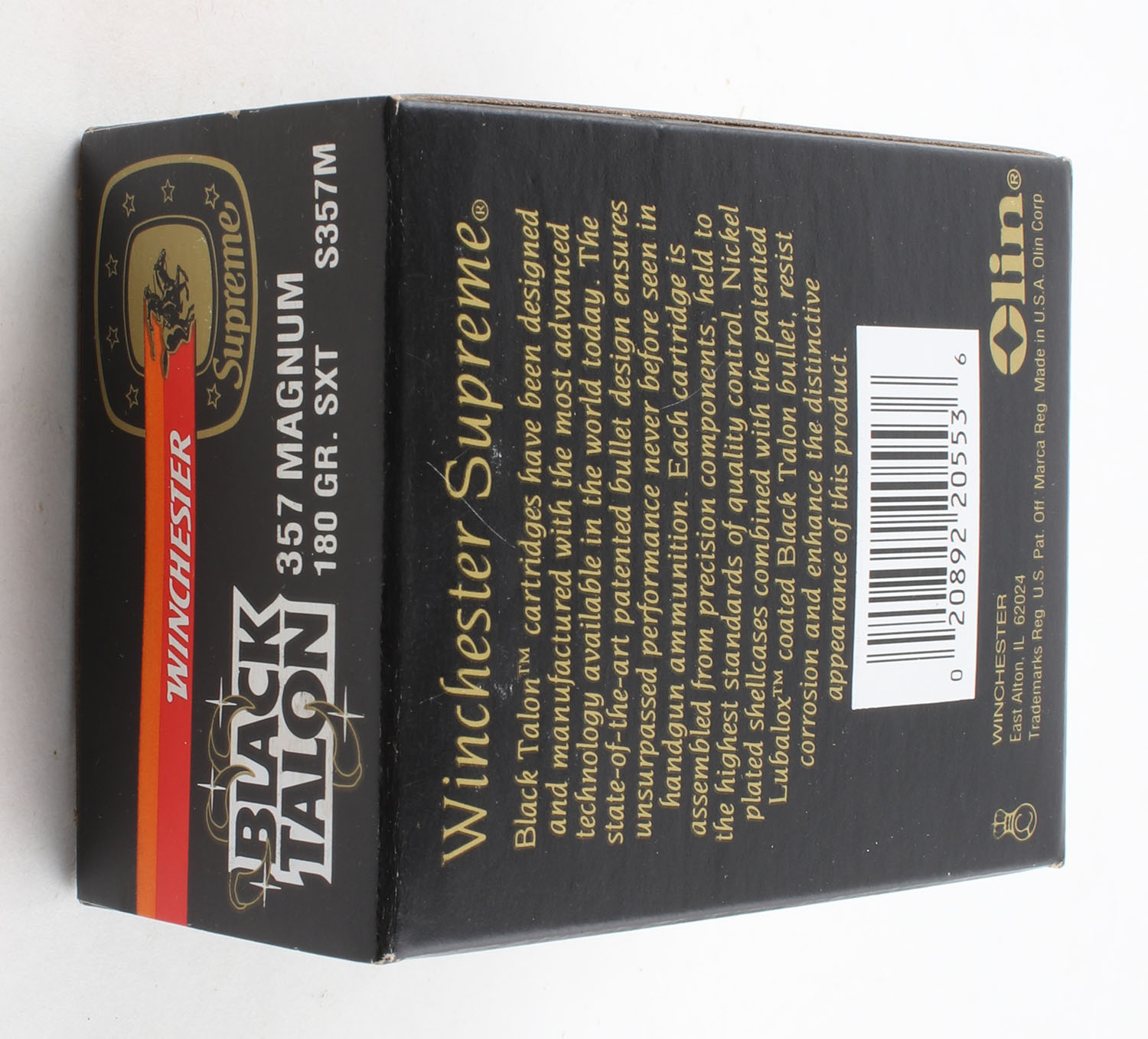 Winchester, Black Talon, .357 Magnum, 180 Gr. SXT, Full, 1pc. Black red & orange box, box is very solid with excellent to minty color, edges are crisp, corners are sharp, end flaps are solid, ammo is minty. Grade: MINT - Value: 40 to 120