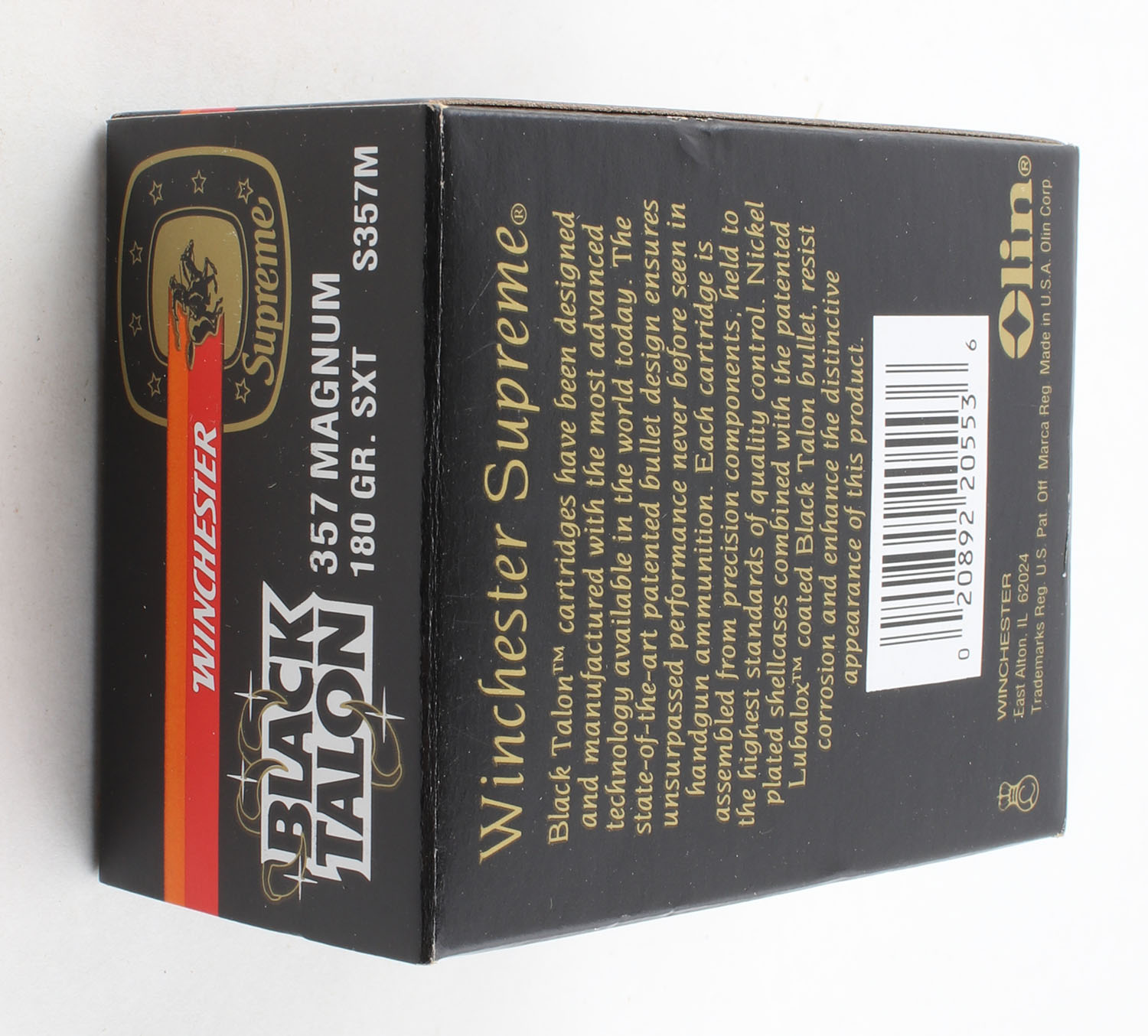 Winchester, Black Talon, .357 Magnum, 180 Gr. SXT, Full, 1pc. Black red & orange box, box is very solid with excellent to minty color, edges are crisp, corners are sharp, end flaps are solid, ammo is minty. Grade: MINT - Value: 40 to 120