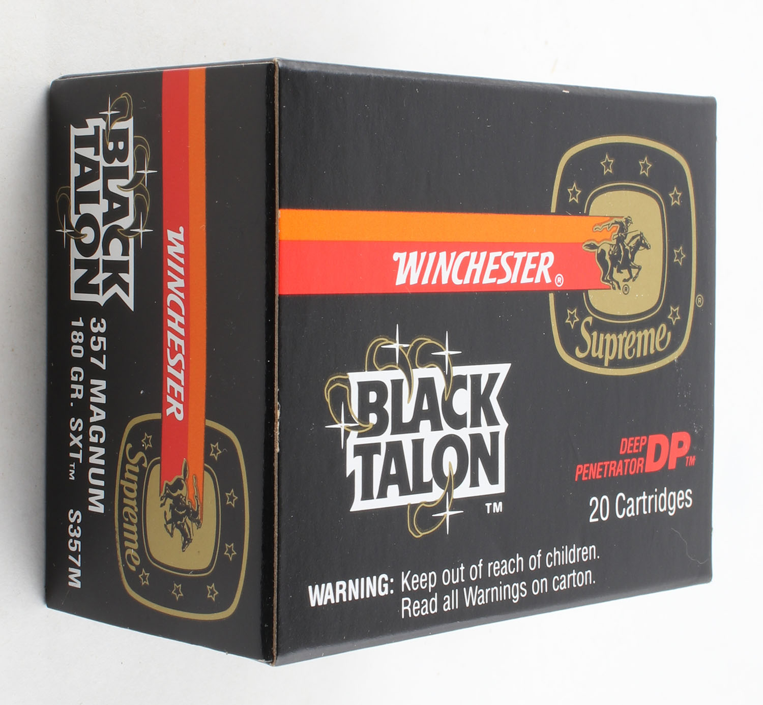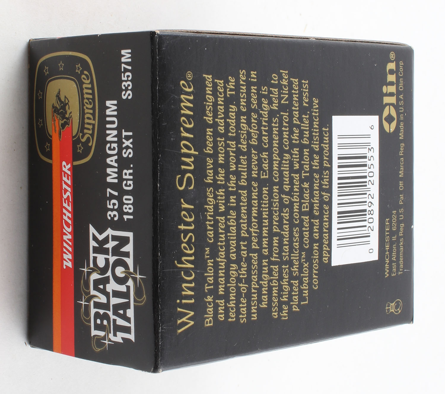 Winchester, Black Talon, .357 Magnum, 180 Gr. SXT, Full, 1pc. Black red & orange box, box is solid with excellent to minty color, edges are crisp, corners are sharp, end flaps are solid, ammo is minty. Grade: MINT - Value: 40 to 120