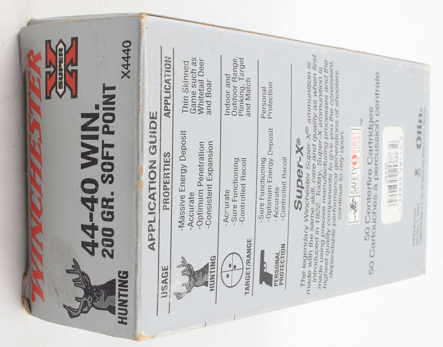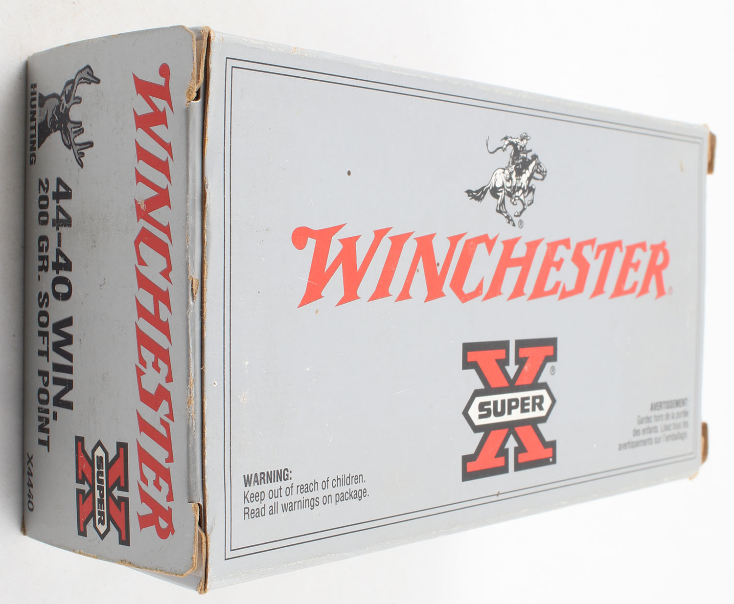 Winchester, Super-X, .44-40 Winchester, 200 Gr. Soft Point, Full, 1pc. Silver & red box, box is solid with very good color, has light scuffing, end flaps are solid, ammo is excellent. Grade: Excellent - Value: 50 to 150