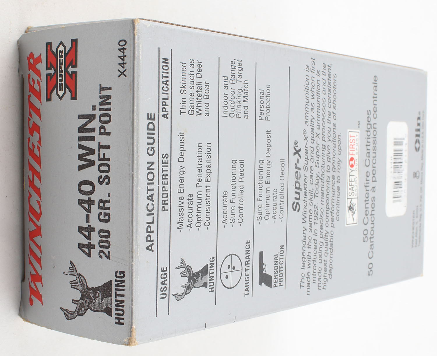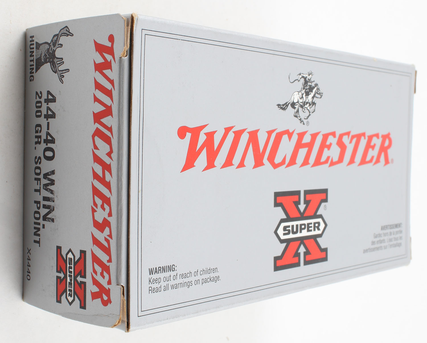 Winchester, Super-X, .44-40 Winchester, 200 Gr. Soft Point, Full, 1pc. Silver & red box, box is very solid with very good, has very minor shelf wear, end flaps are solid, ammo is excellent. Grade: Excellent + - Value: 50 to 150