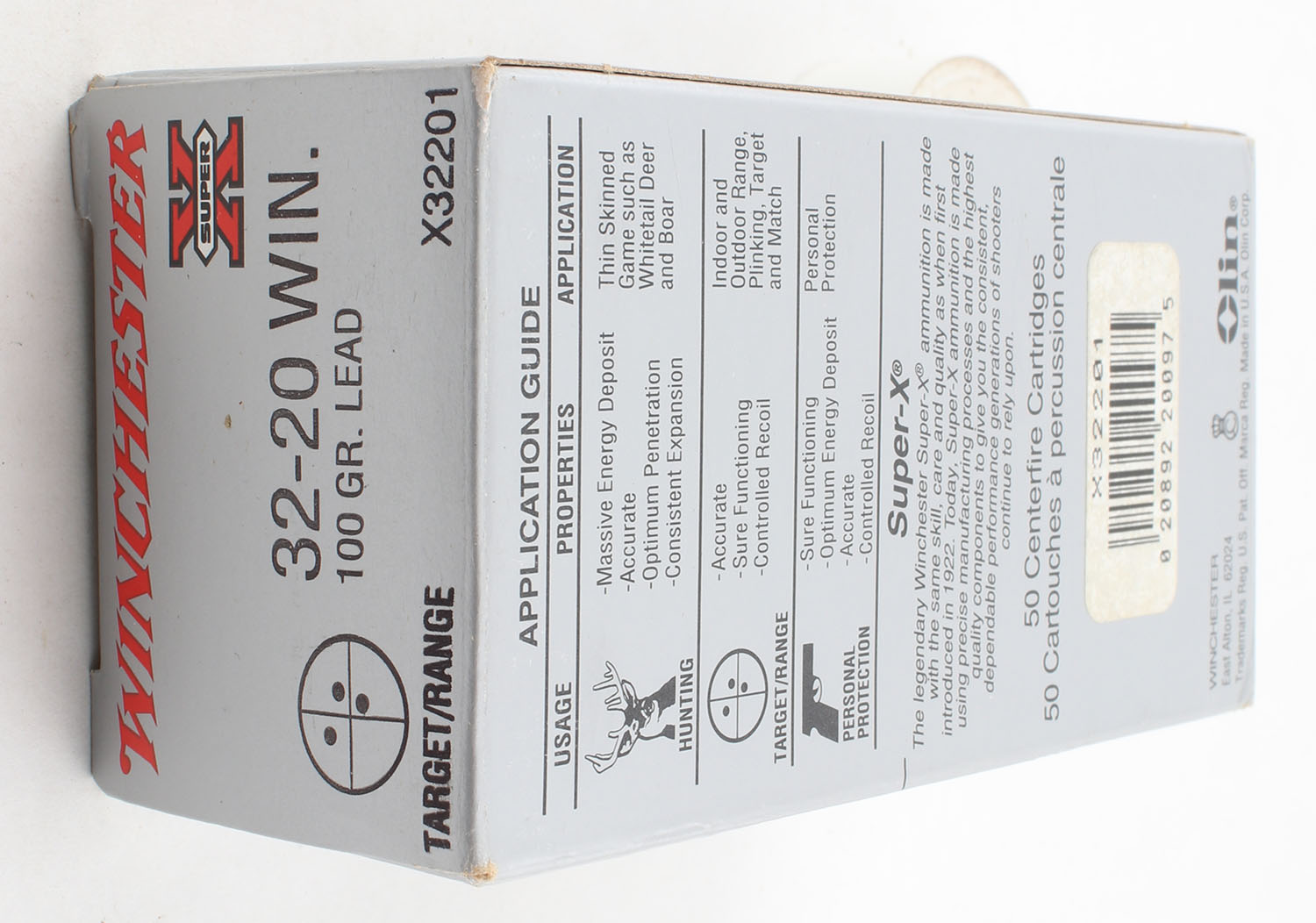 Winchester, Super-X, .32-20 Winchester, 100 Grain Lead, Full, 1pc., Silver & red box, box is very solid with excellent color, end flaps are solid, ammo is excellent. Grade: Excellent ++ - Value: 60 to 90