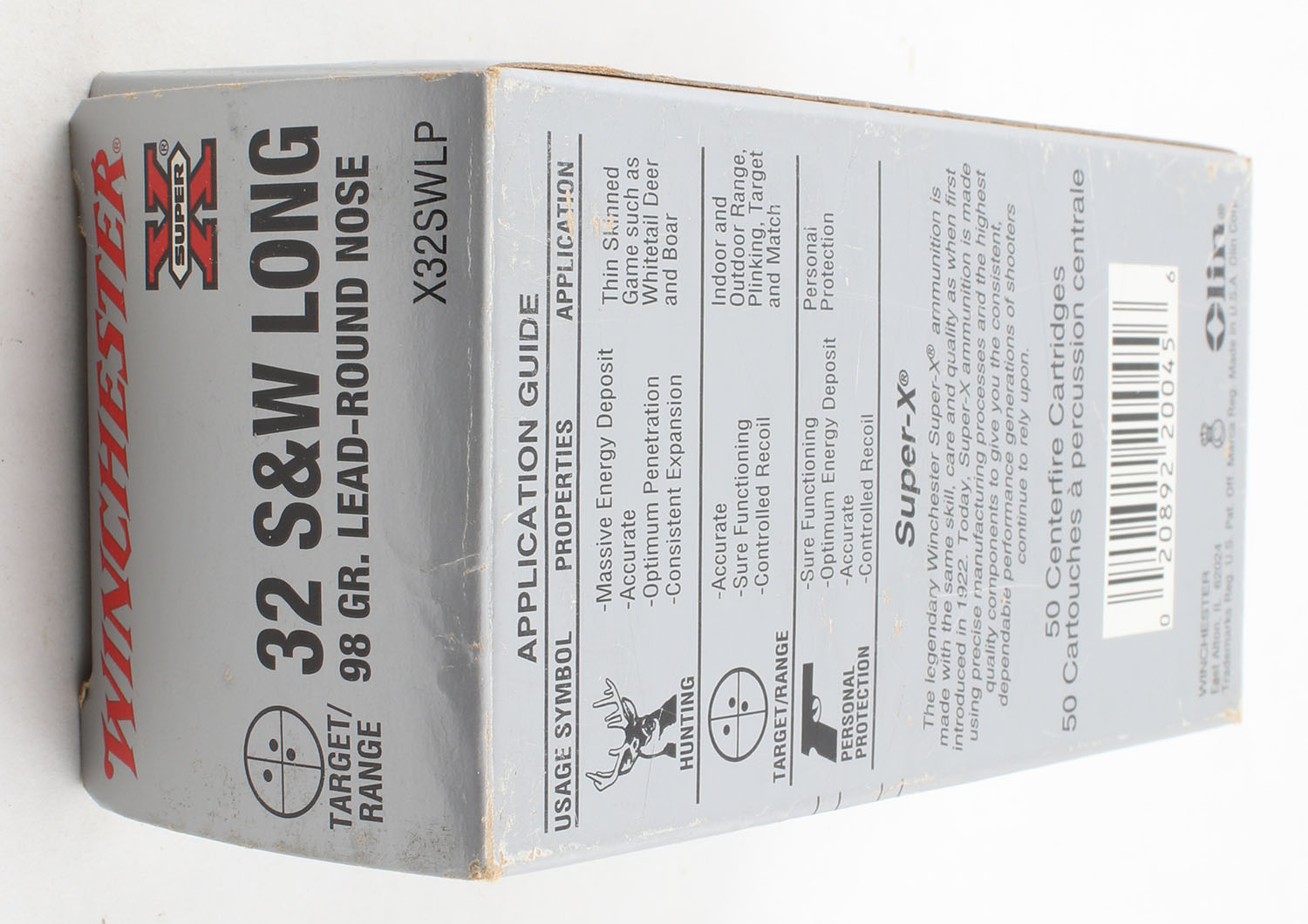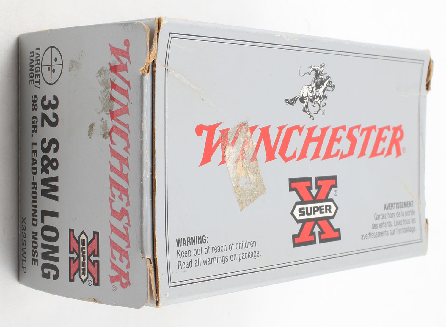 Winchester, Super-X, .32 Smith & Wesson Long, 98 Grain Lead RN, Full, 1pc., Grey & red box, box is solid with very good color, has light scuffing with rub marks, end flaps are solid, ammo is very good to excellent. Grade: Very Good + - Value: 20 to 40