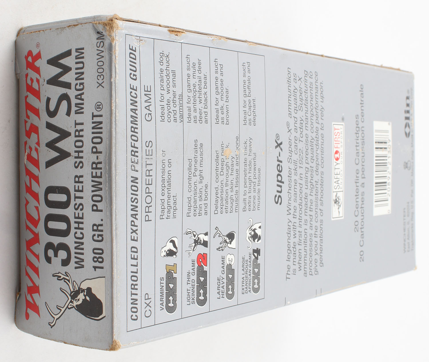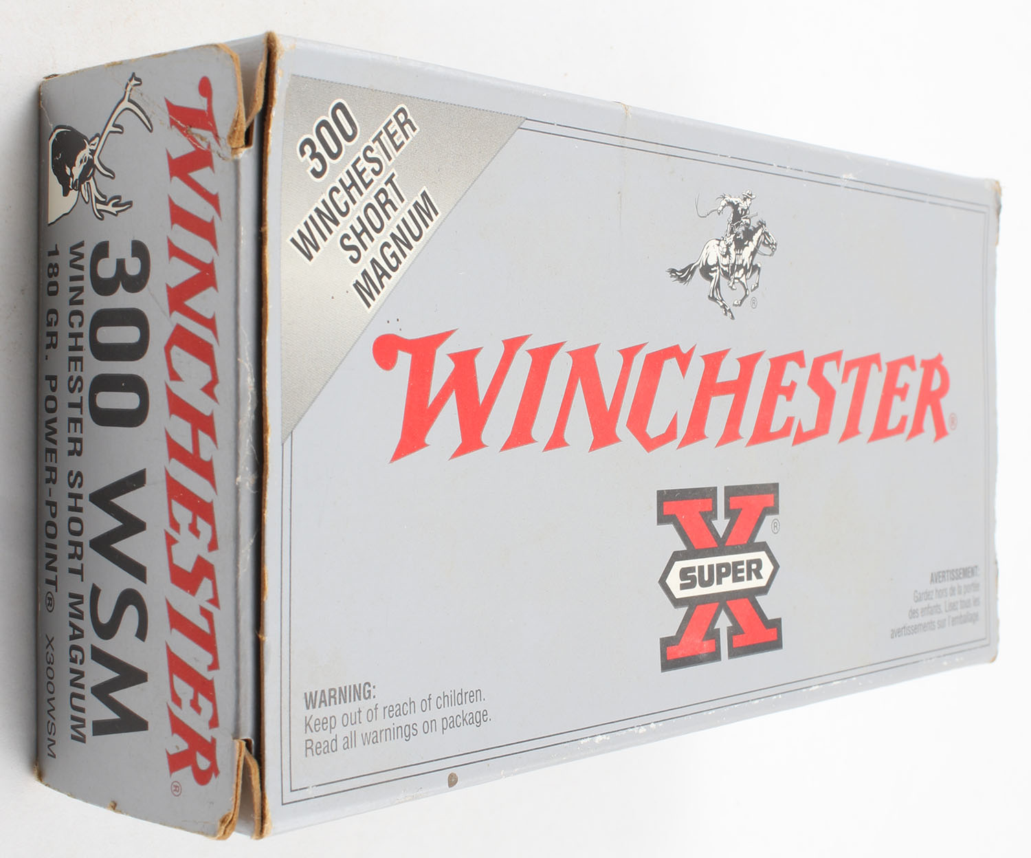 Winchester, Super X, .300 WSM, 180 Grain Power-Point, Full, 1pc. Silver & red box, box is solid with excellent color, has light scuffing, light corner wear, end flaps are solid, ammo is excellent. Grade: Very Good ++ - Value: 6 to 10
