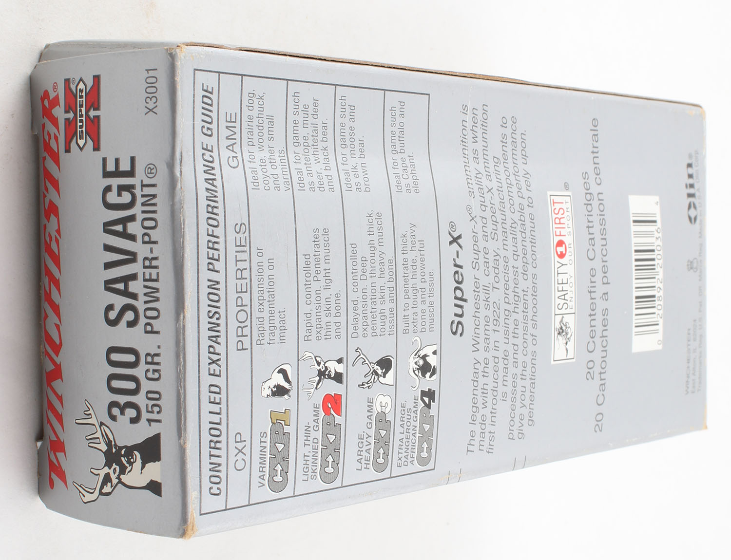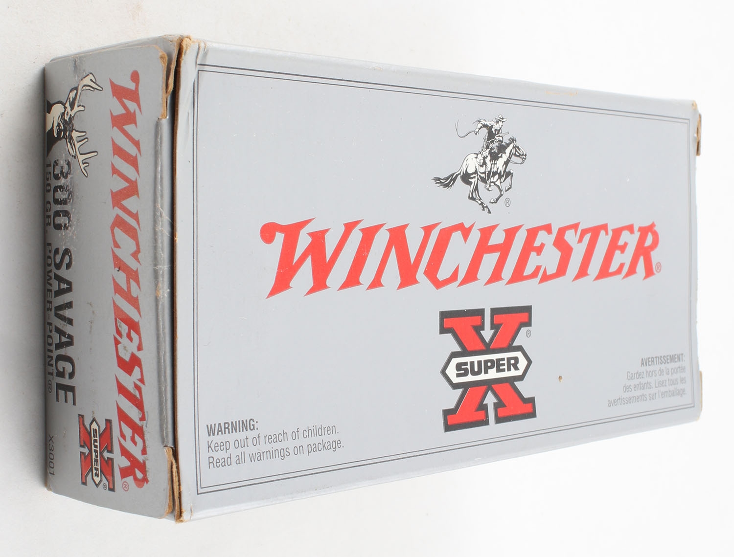 Winchester, Super-X, .300 Savage, 150 Grain Power Point, Full, 1pc., Silver & red box, box is solid with excellent color, has minor scuffing, light corner wear, end flaps are solid, ammo is very good. Grade: Very Good ++ - Value: 20 to 40