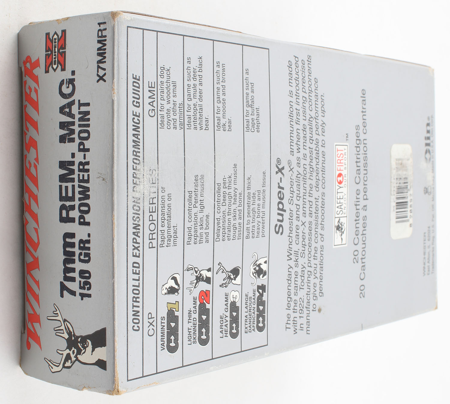 Winchester, Super-X, 7mm Rem. Mag., 150 Grain Power Point, Full, 1pc., Silver & red box, box is solid with excellent color, has light scuffing with sticker residue on front, end flaps are solid, ammo is excellent. Grade: Very Good ++ - Value: 10 to 30