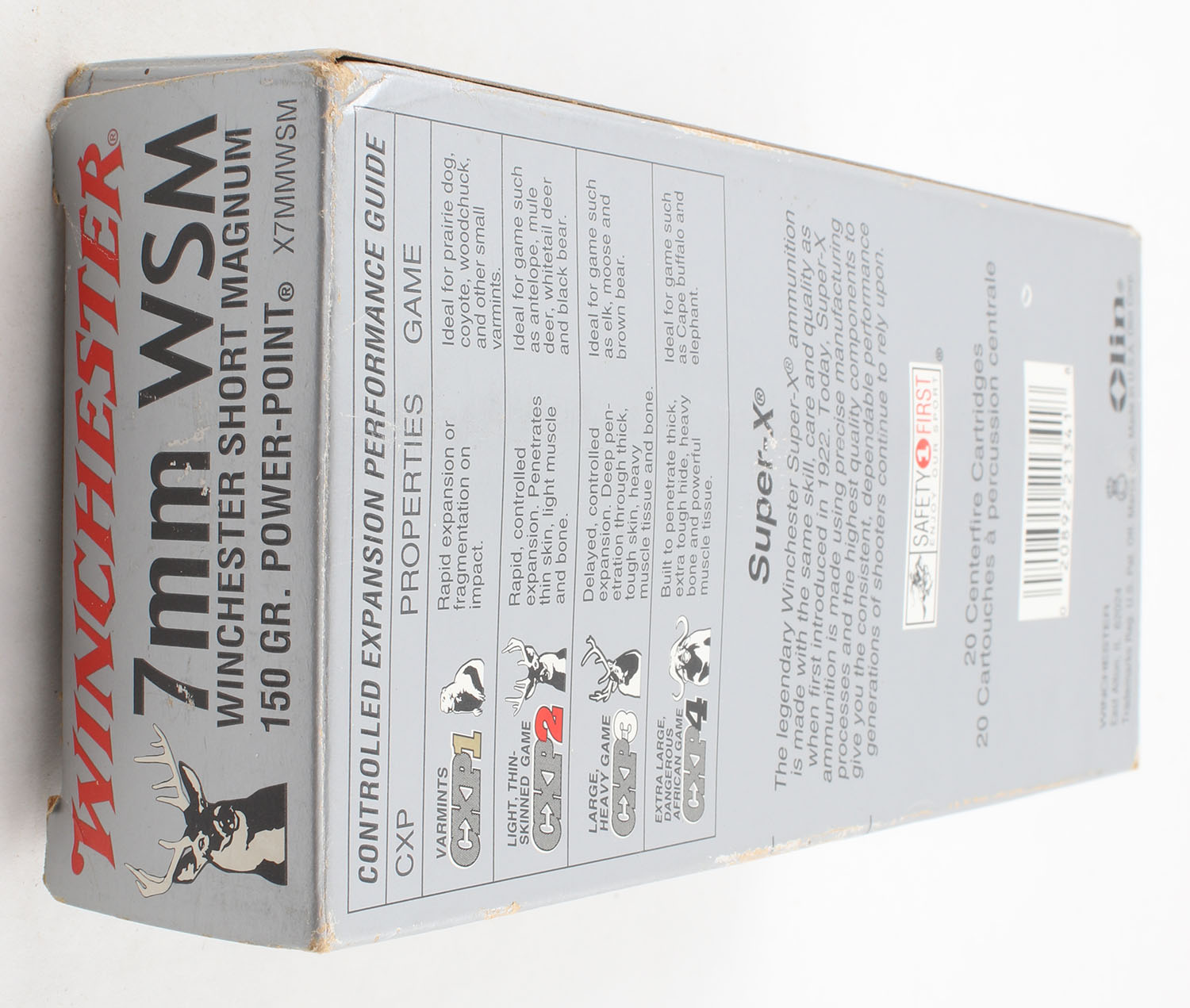 Winchester, Super-X, 7mm WSM, 150 Grain Power Point, Full, 1pc., Silver & red box, box is solid with excellent color, box has light scuffing, minor corner wear, end flaps are solid, ammo is excellent. Grade: Excellent - Value: 30 to 45