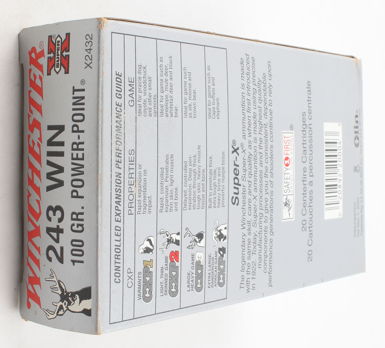 Winchester, Super-X, .243 Winchester, 100 Grain Power Point, Full, 1pc., Silver & red box, box is solid with excellent color, has minor corner wear, end flaps are solid, ammo is good. Grade: Very Good ++ - Value: 20 to 50