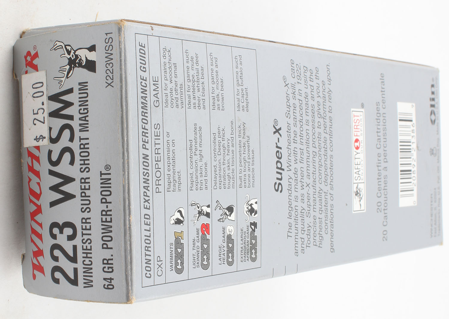 Winchester, Super X, .223 WSSM, 64 Grain Power-Point, Partial 17rds., 1pc. Gray & red box, box is very solid with excellent color, has minor corner wear, end flaps are solid, ammo is minty. Grade: Very Good ++ - Value: 20 to 60